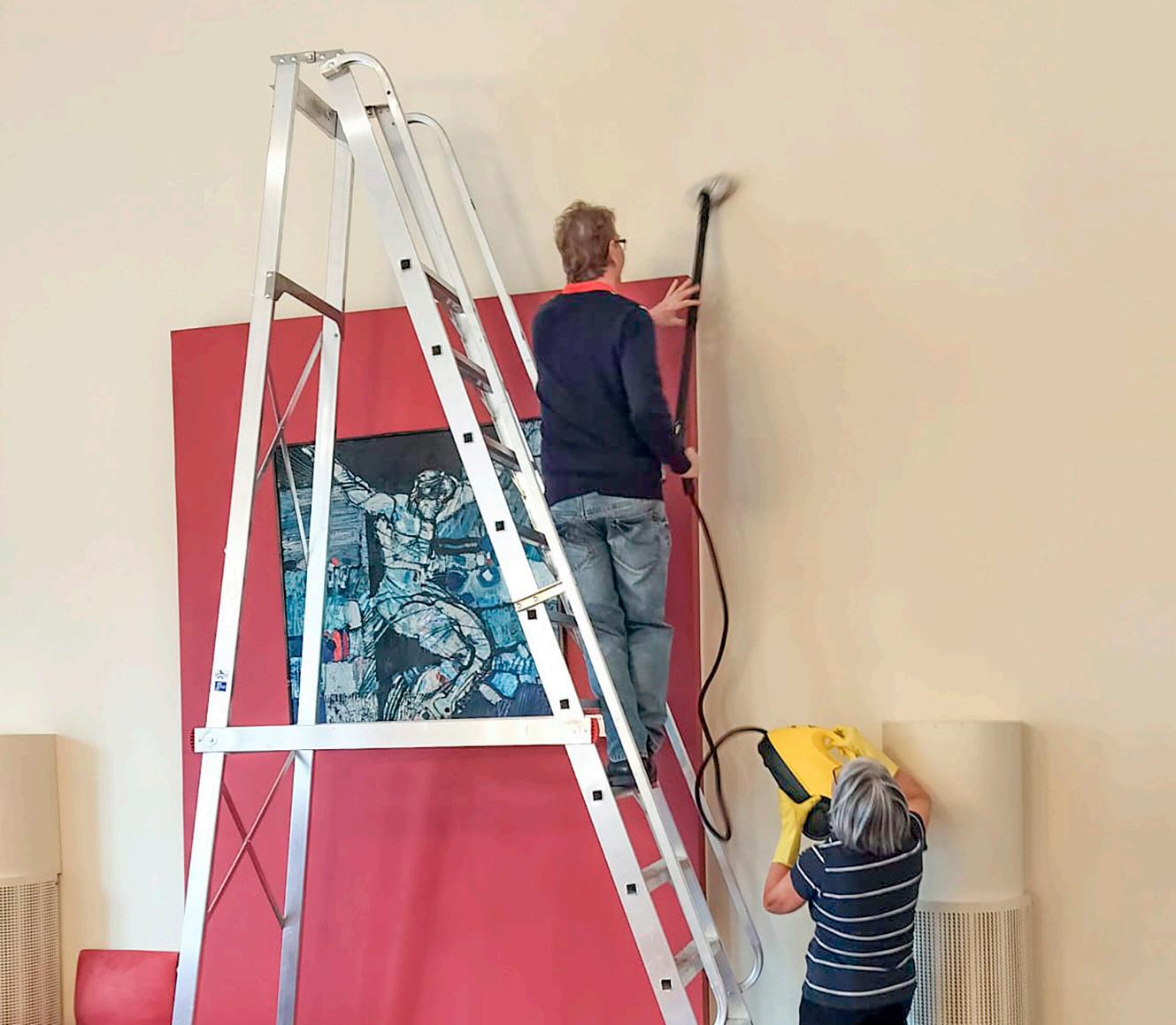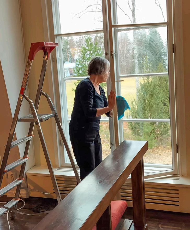 Anne R ja Eskon vaimo Raija pesivät nihkeällä tuolit ja alttarikaiteet. Elisa pesi seinät siihen asti, mihin ylsi. Anne H oli ottanut höyrypesu -