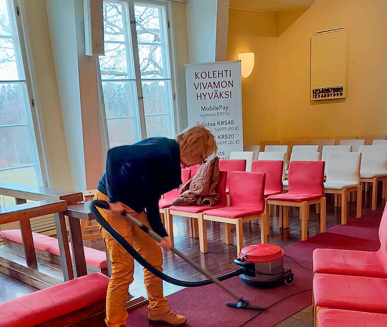 rin mukaan, jolla hän sai sakastin ja Pyhäsalin pehmustetut huonekalut puhtaammiksi. Paula pesi kirkon ikkunat sisältä ja väleistä.