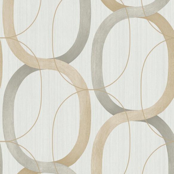 Pattern Interlock’s shining, curvaceous ribbons are overlayed by metallic ovals to create fresh geometric style.