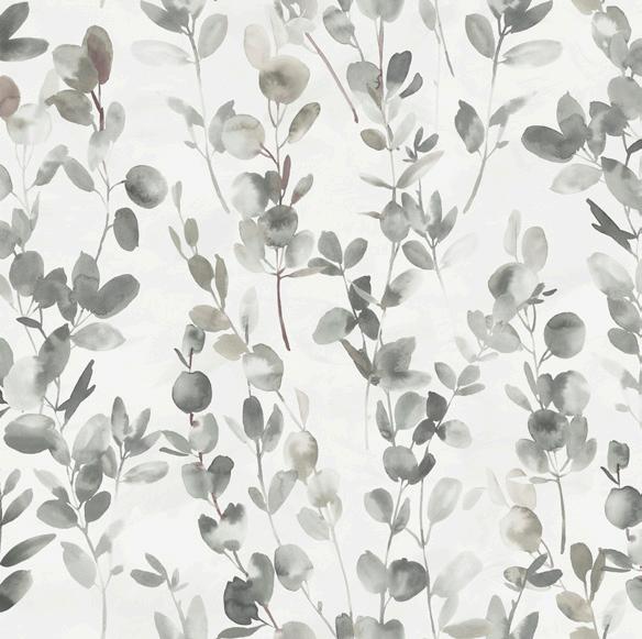 Botanicals spring to life in the fresh, floating sprigs and silver dollar leaves of pattern Joyful Eucalyptus.