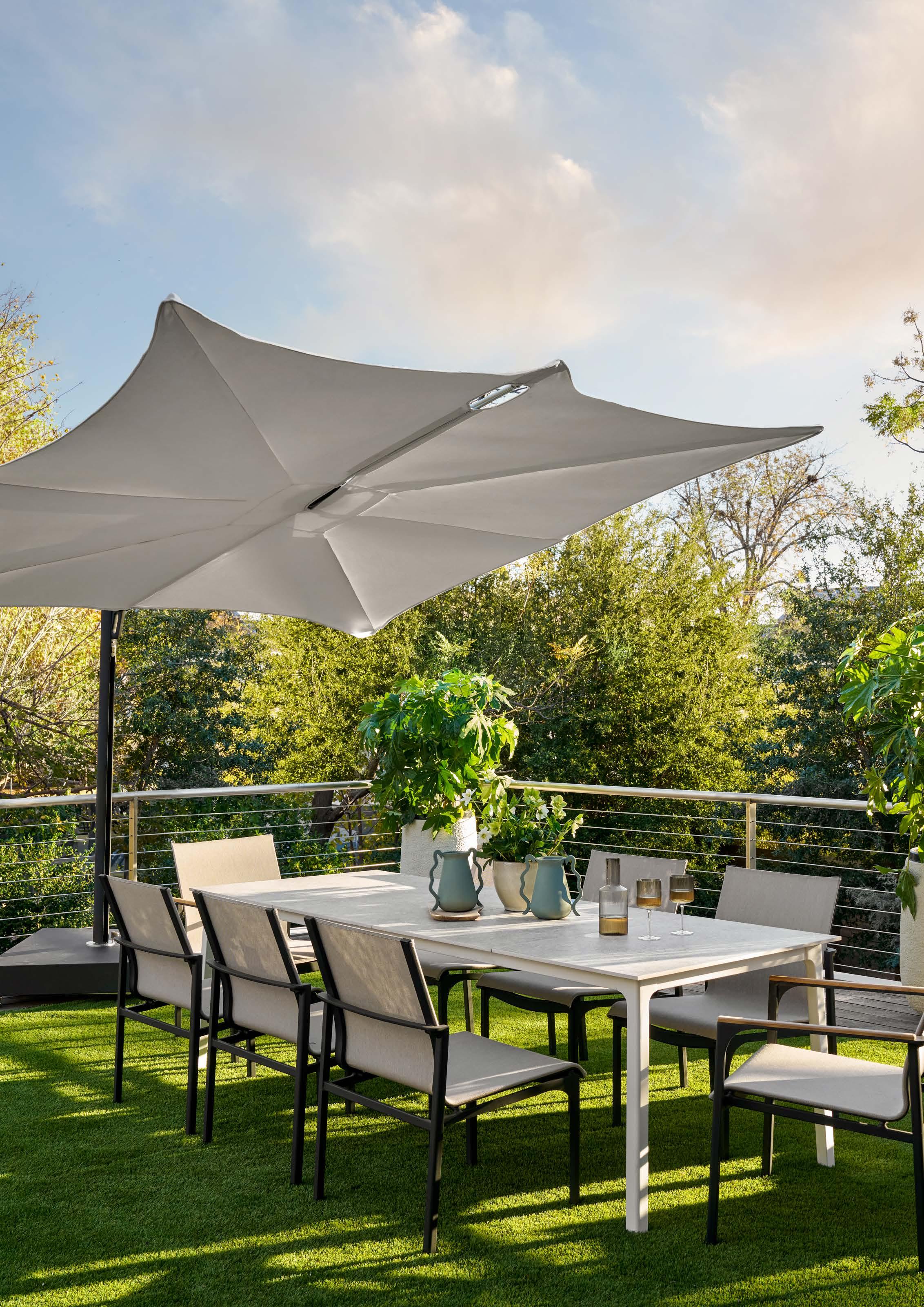 Opposite: Adapt Dining Table OT8, Miles Arm Chair BT806A, Miles Side Chair BT806S, Summit Cantilever 10’ Umbrella OTB812