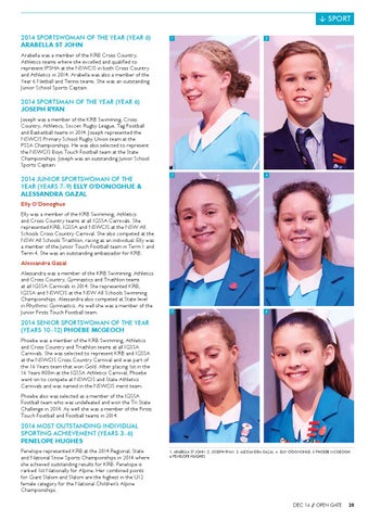 2014 SPORTSMAN OF THE YEAR (YEAR 6) JOSEPH RYAN Joseph was a member of the KRB Swimming, Cross Country, Athletics, Soccer, Rugby League, Tag Football and Basketball teams in 2014. Joseph represented the NSWCIS Primary School Rugby Union team at the PSSA Championships. He was also selected to represent the NSWCIS Boys Touch Football team at the State Championships. Joseph was an outstanding Junior School Sports Captain.