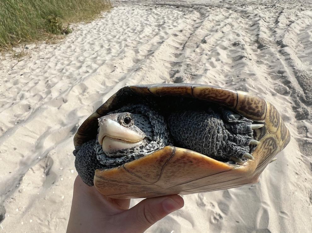Female diamondback terrapin found returning to the bay after nesting on Bennett’s Pier Beach.