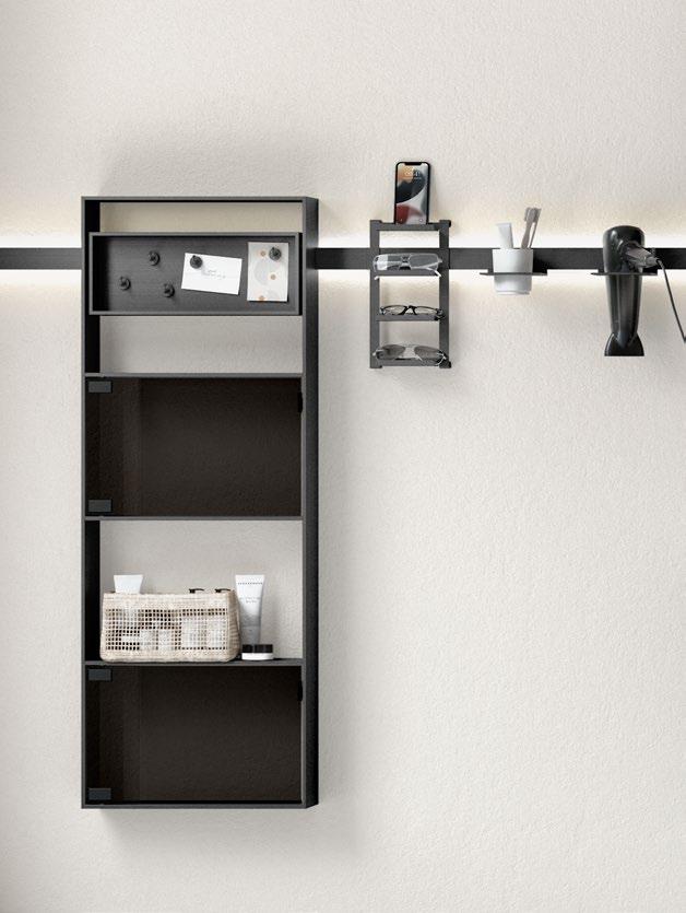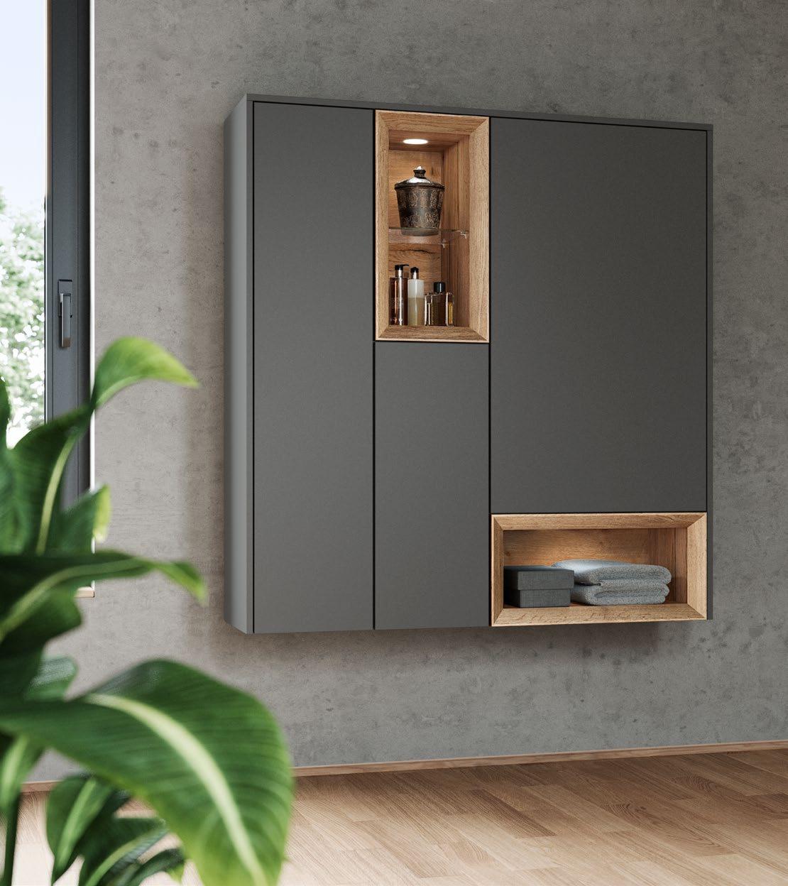 Verzorgingsproducten en badkameraccessoires zijn in onze midikast altijd binnen handbereik. De geïntegreerde verlichting achter het elegante front van zwart glas geeft daarbij stijlvolle accenten en creëert voor elke setting de juiste lichtambiance.