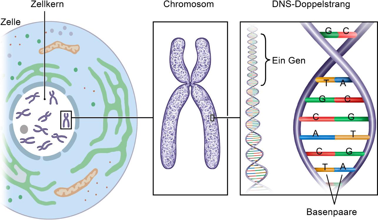 Unser Körper besteht aus Billionen von Zellen. Im Kern jeder Zelle ist das gesamte Erbgut eines Menschen. Das Erbgut ist der Bauplan von unserem Körper. Dieser Bauplan besteht aus Chromosomen. Die Chromosomen wiederum bestehen aus leiterförmigen DNS-Strängen (DNS steht für Desoxyribonukleinsäure). Einzelne Abschnitte von DNS-Strängen heissen Gene.