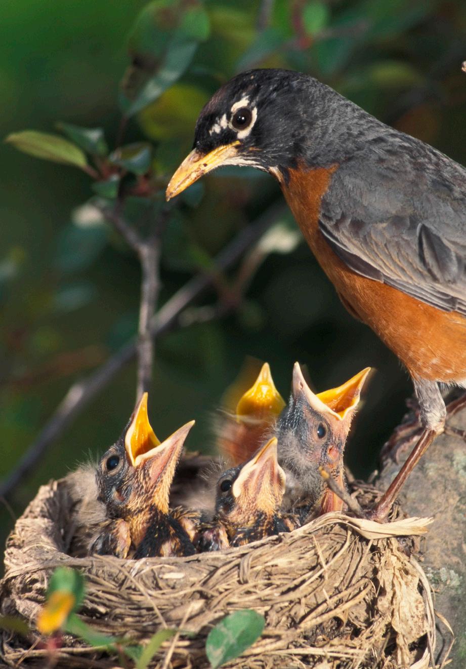 Spring is full of robust robin song, and contented robins may scurry about while we are in our backyard with a “tut” or “tut tut” call notes. They pay us little attention (perhaps seeing us as that old friend, too), but they will have little patience for another pair of robins in their yard. Full body combat is common and will likely chase another robin out of their territory. They provide one of the easiest life cycles for students and families to witness. Their mud bowl nest is finely constructed with grasses and small twigs. It’s often placed in easy view for humans; the birds seem to have confidence the human neighbor is no bother to them. Their clutch of three to five eggs may take almost two weeks to hatch. If young fledglings fall out of a nest, the parent birds do not mind at all if a human hand lifts the youngster back. However, if an independent youngster feels the need to escape too often, a parent will feed and care for it outside of the nest.