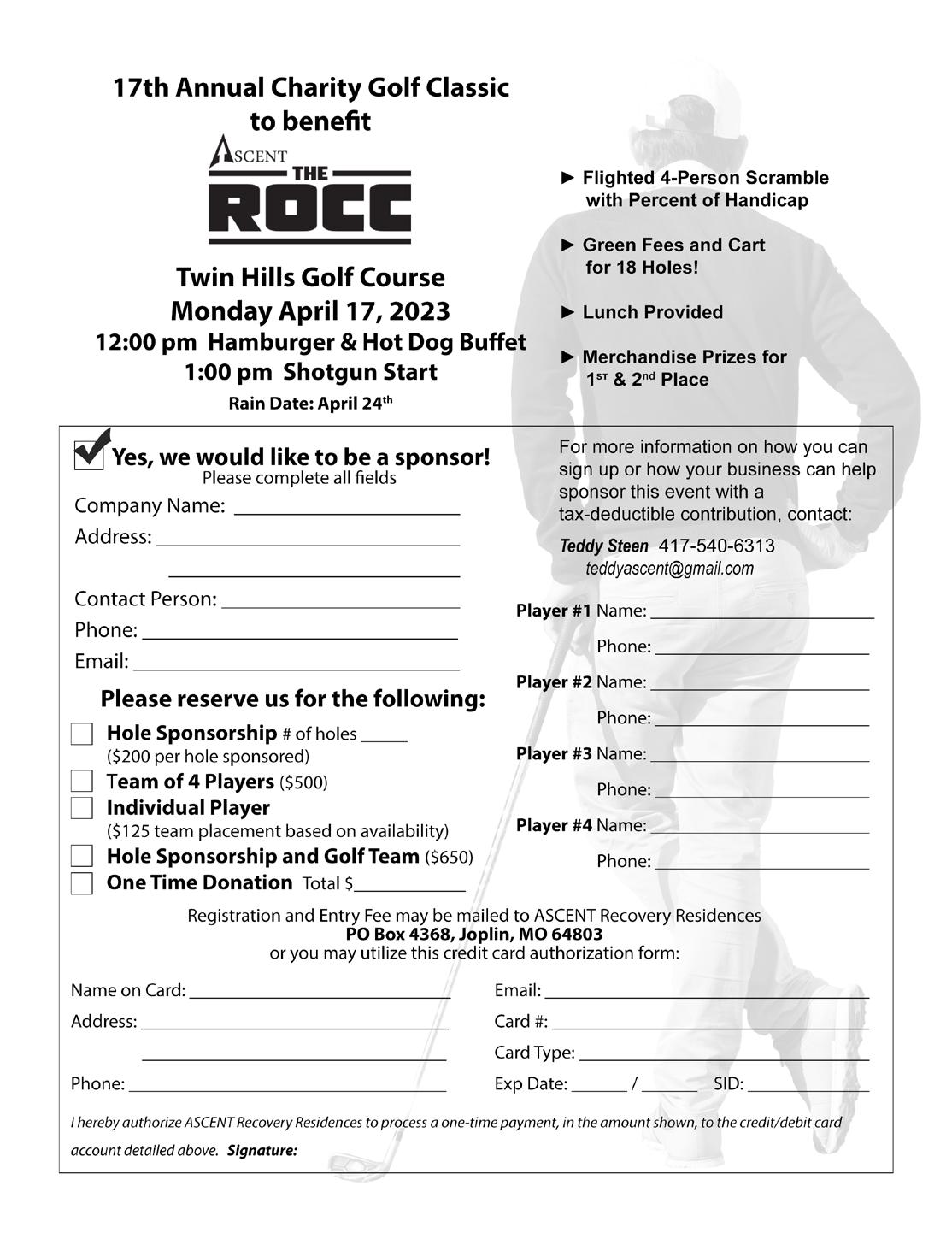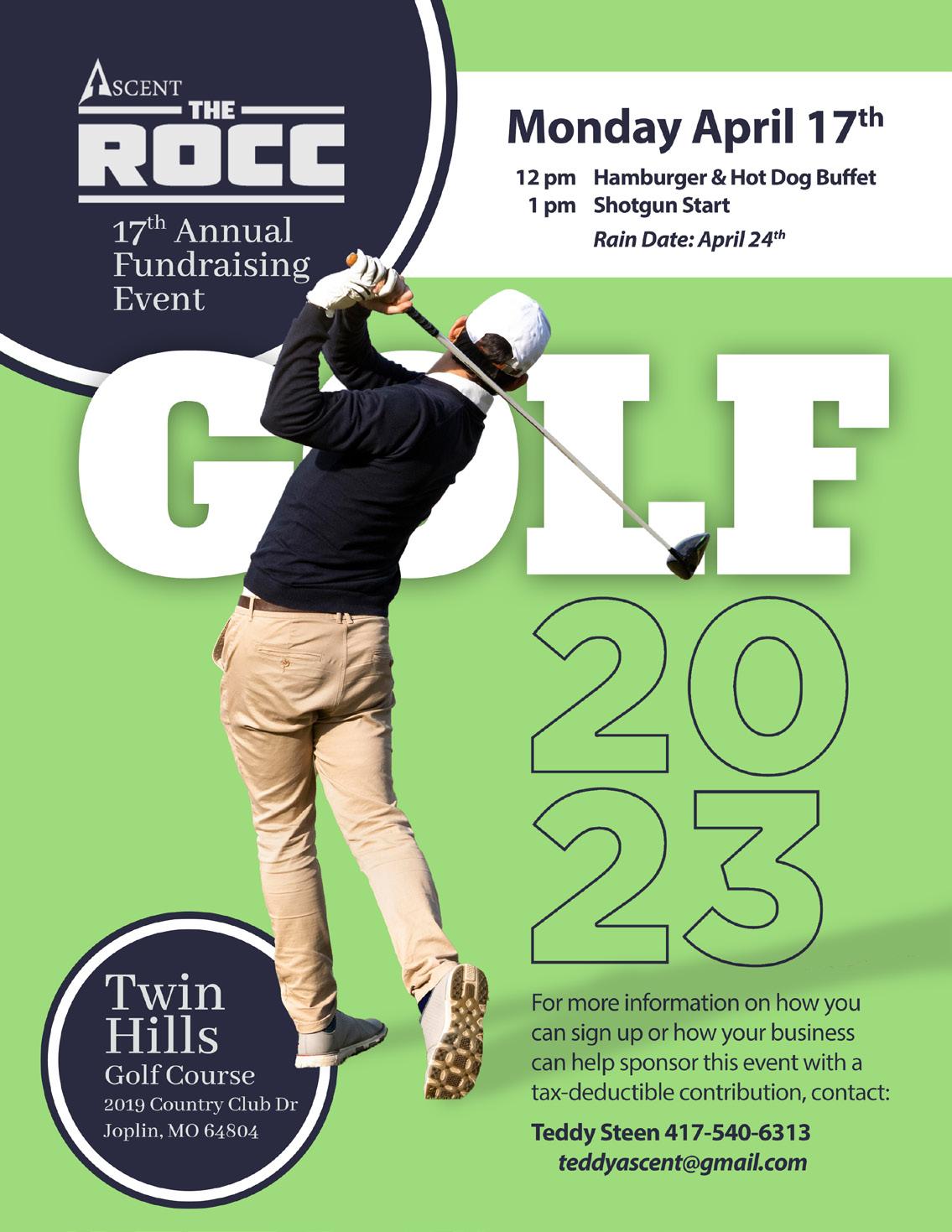 The annual charity golf classic to benefit ASCENT and The ROCC (Recovery Outreach Community Center) will take place Monday, April 17, at Twin Hills Golf Course. A hamburger and hot dog buffet will start at 12 p.m. with a 1 p.m. shotgun start.