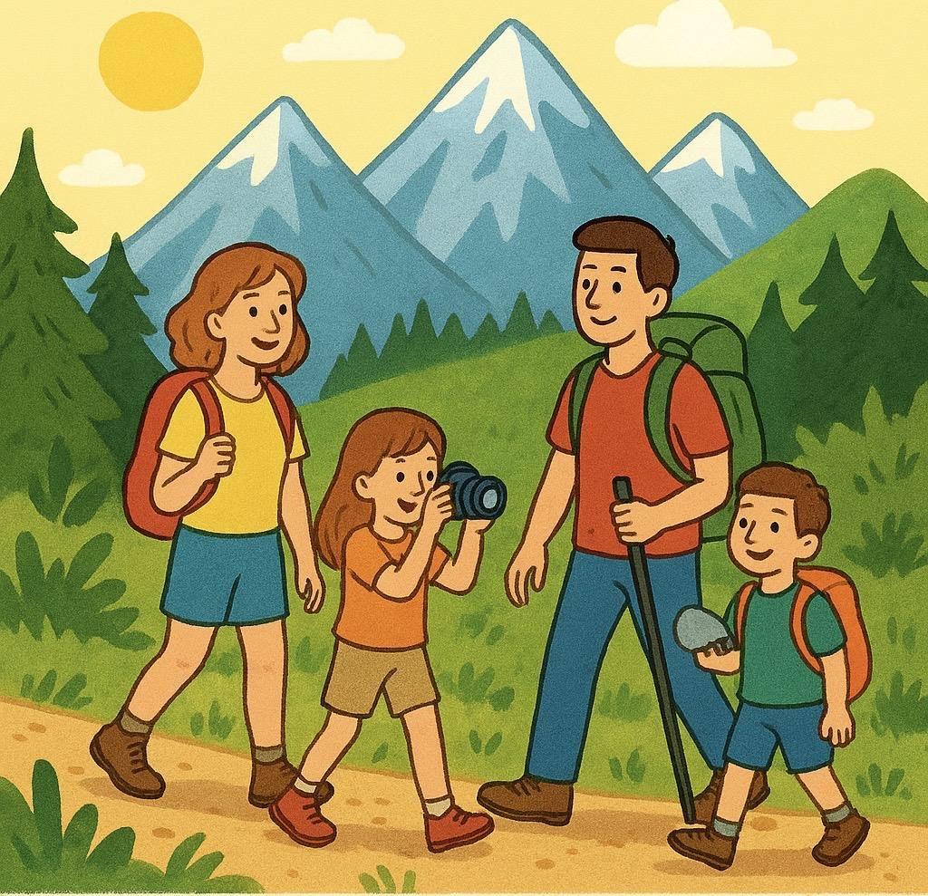 In August, I went to the mountains. It was warm and sunny. I went there with my family. We walked in the forest and had picnics. I took many photos and played games with my brother. I didn’t buy any souvenirs, but I found pretty stones. It was wonderful!