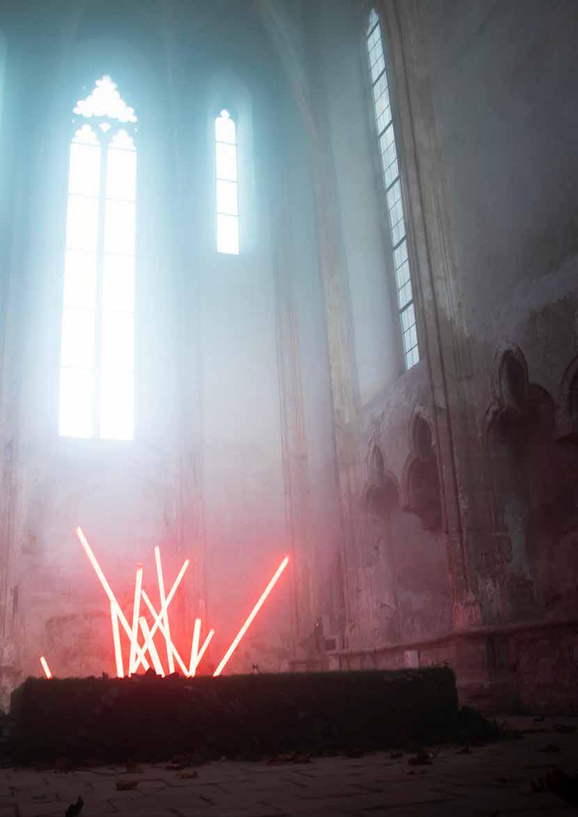 Das Coverfoto zeigt die Installation „Ignis fatuus“ von Manuel Biedermann und Alice Wolfszahn in der Ursulakapelle (LICHTFEST Krems 2022)