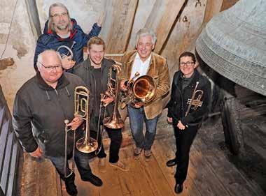 Das Bläserensemble Krems von links nach rechts: Alfred Knappel (Posaune), Benedikt Etzel (Posaune), Silvester Biro (Tenorhorn), Eva Knappel (Trompete), hinten: Manfred Denk (Trompete)