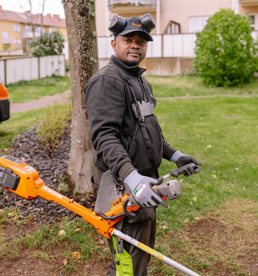 Joseph Iwebenua har ett jobb som han verkligen trivs med på Byggebo, där han arbetar med den yttre förvaltningen.