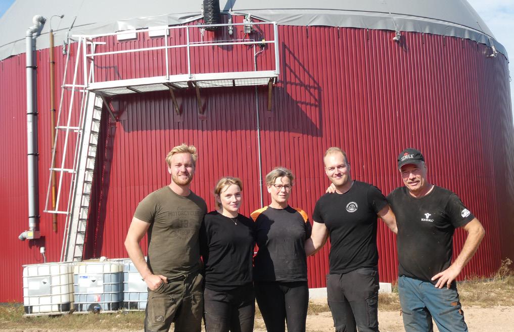 Investering som gav energi. ”Biogasanläggningen på gården har gjort oss självförsörjande på el och värme”, säger Albin, Ella, Berit, Mattias och Tommy.