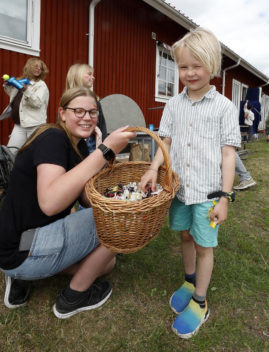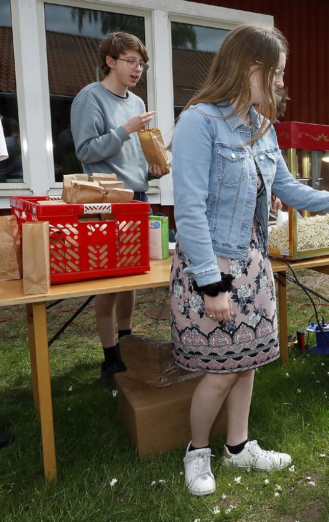 Kyrkans Unga var ansvariga för popcornstationen. Här räcker Medéa Andersson över popcornpåsar till Liv Jonneryd, sju år och Hilda