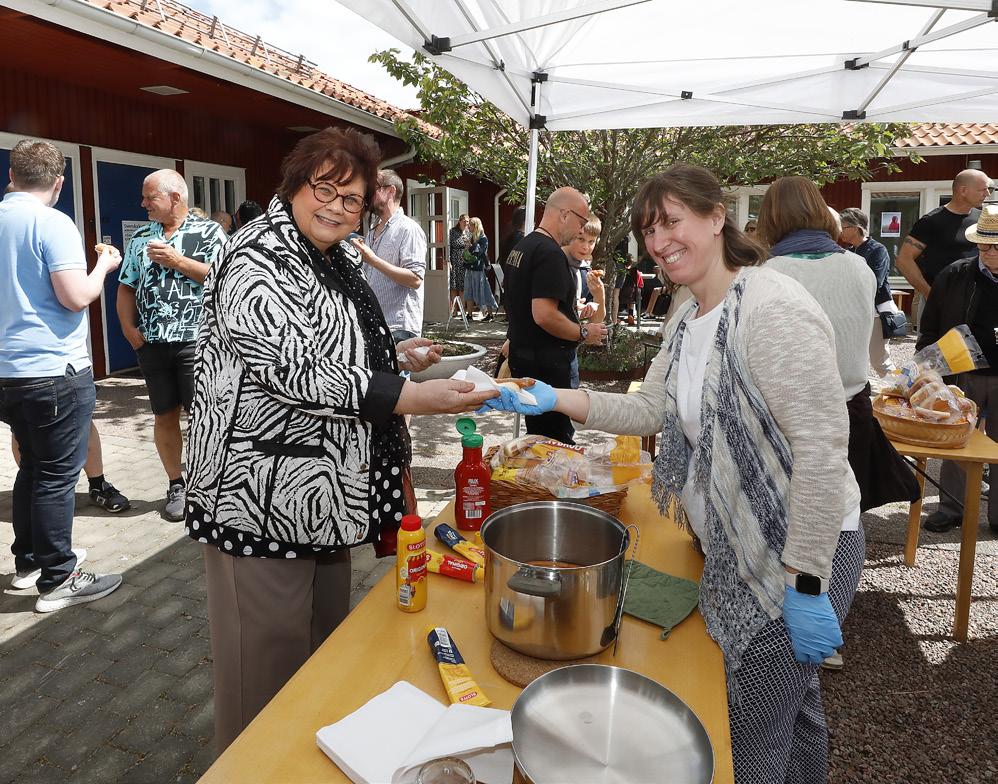 Församlingens kanslist Sharelle Sånglöf räckte över en korv med bröd till Rose-Marie Wirzén. ”Det var så fint när barnen sjöng i kyrkan. Allt har verkligen varit jättebra”, säger Rose-Marie.