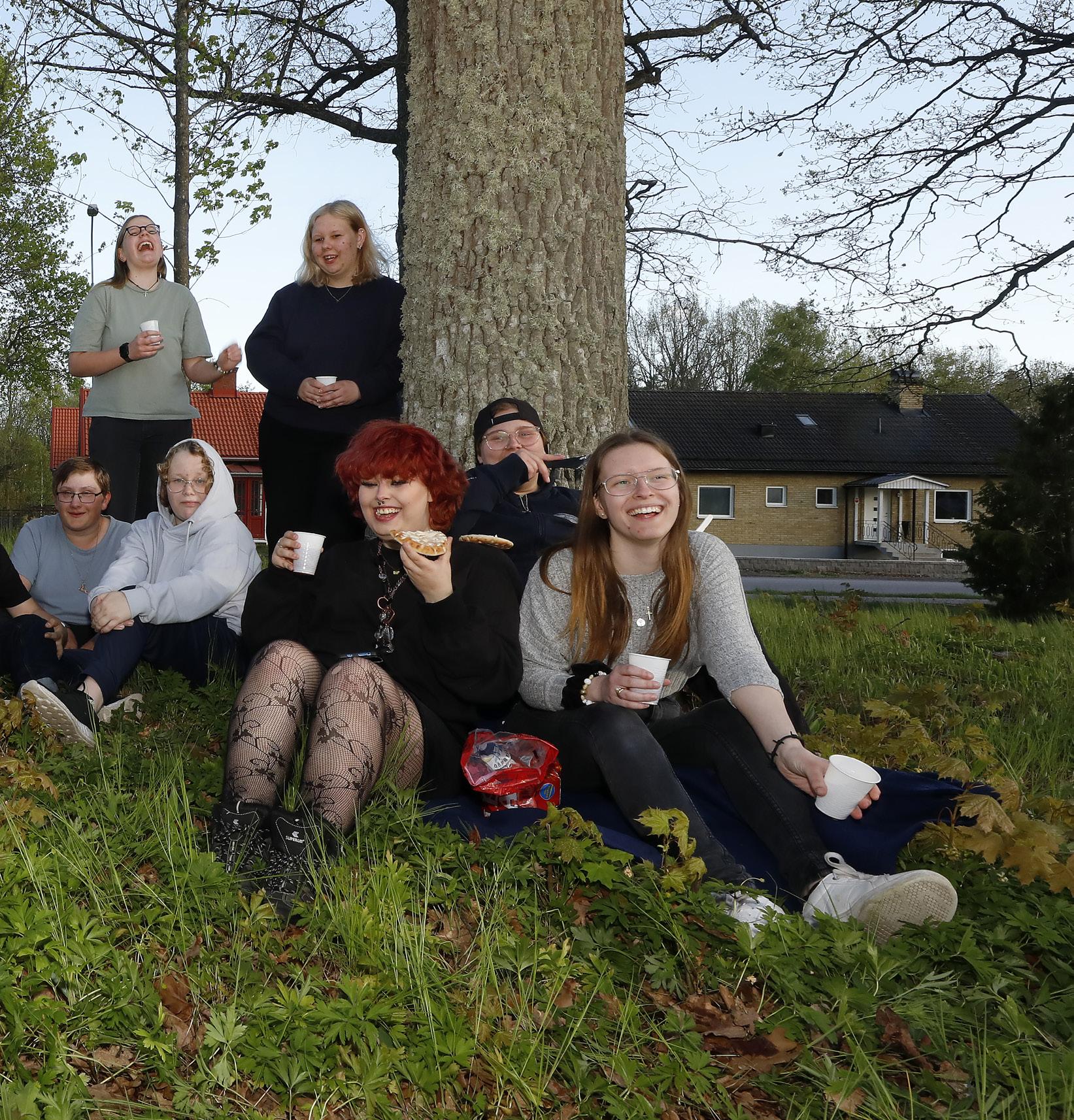 Mitt i grönskan sitter en del av ungdomarna som är med i KU, Kyrkans Unga, och fikar. Det är en grupp där alla kan hänga med alla. På bilden syns också ungdomsledare Petter Karlsson och förra läsårets trainee Johannes Hedell.
