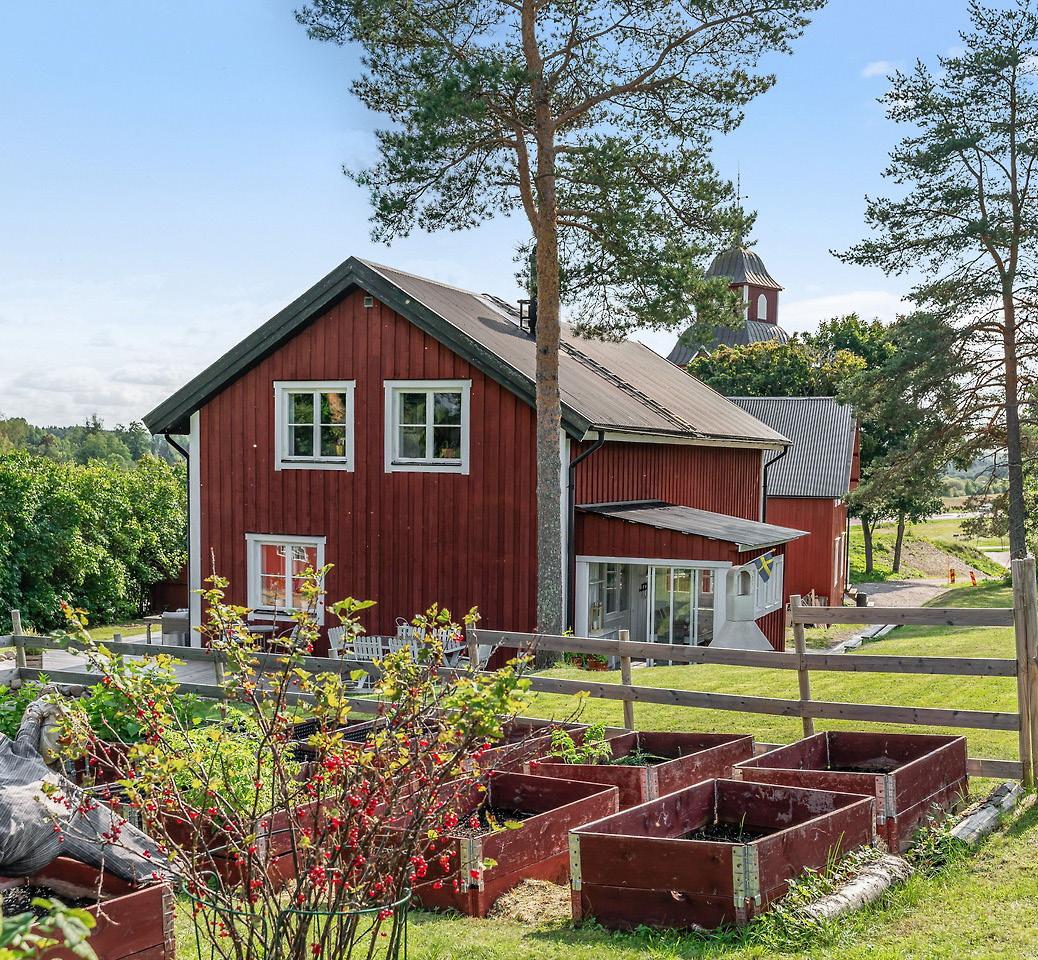 I den gamla ladan har Fredrik Holmqvist inrett en snickarverkstad. På den 1,7 hektar stora tomten finns det växthus där det bland annat odlas chili och tomater. Nästa projekt för familjen är att skaffa egna höns.