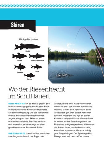im Wassereinzugsgebiet des Flusses Emån im Nordwesten der Kommune Mönsterås. Die schöne Umgebung und das Vorkommen von u.a. Prachttauchern machen einen Angelausflug auf dem Skiren zu einem echten Naturerlebnis. Der See ist fischund artenreich, er beherbergt vor allem gute Bestände an Plötze und Schlei. BARSCH GIBT ES überall im See, am sicher-