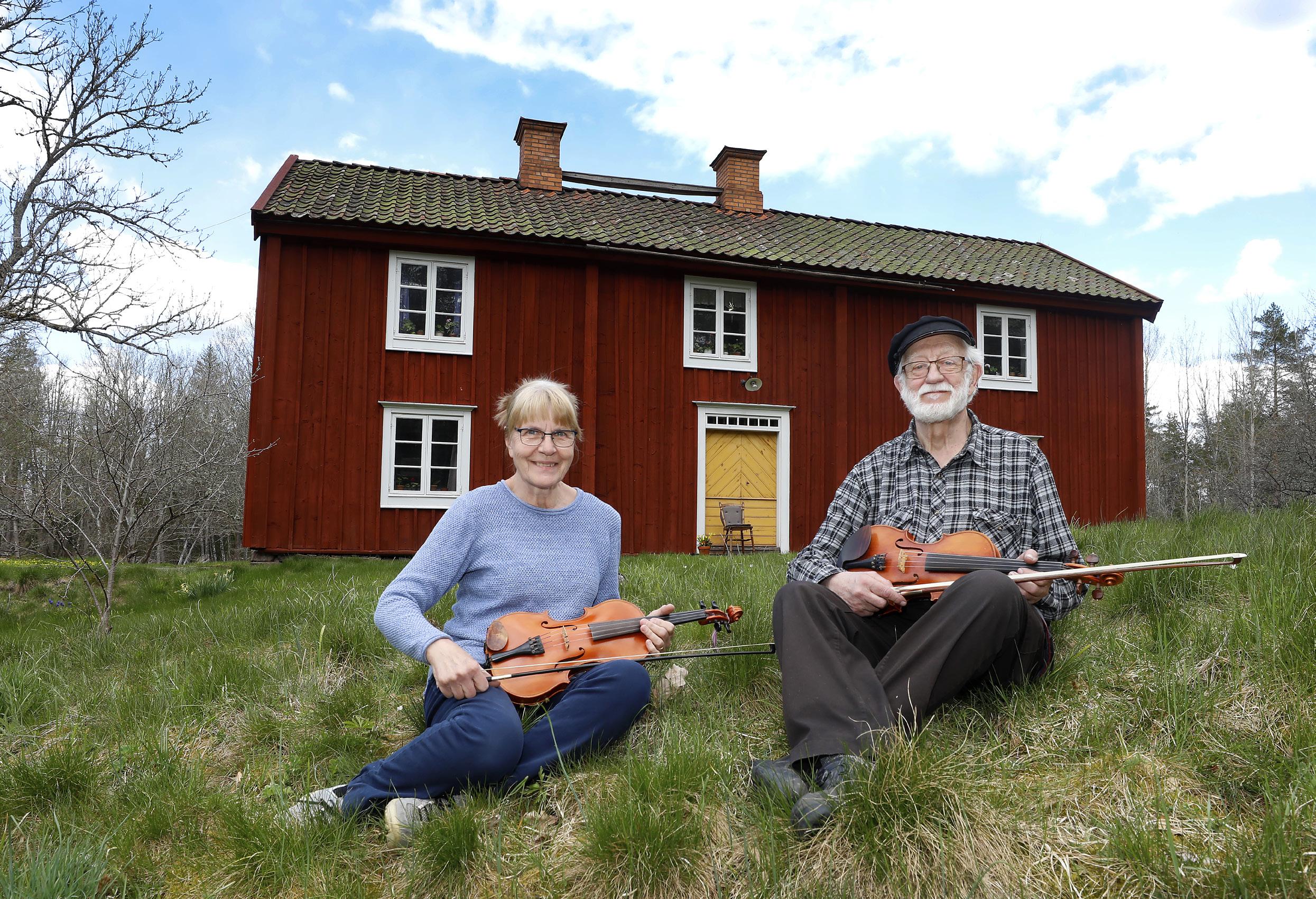 Både Bengt och Eva har spelat fiol sedan de var barn. Här stämmer de upp i vardagsrummet hemma i Århult.