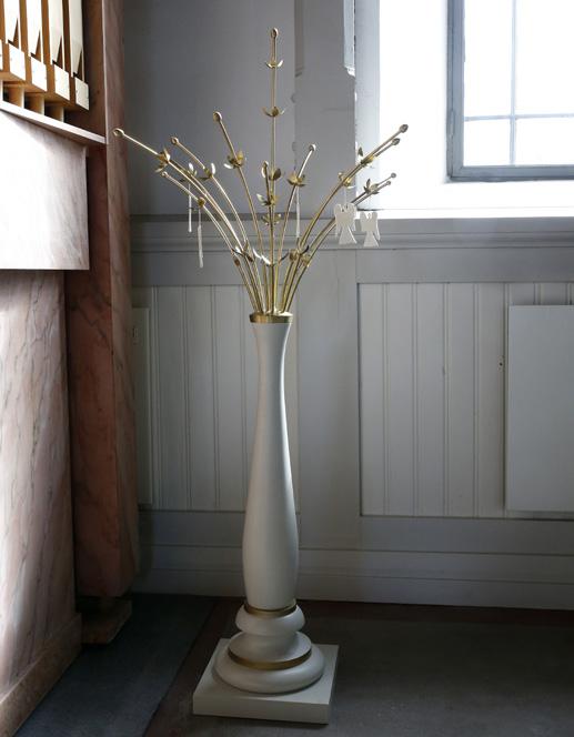 Jag är uppväxt bland hyvelspån, så det kändes naturligt att ta över min fars verkstad.Dopljushållare i trä av Bengt Löfberg, Fagerhults kyrka.