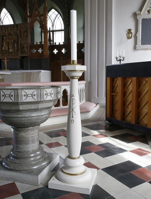 – De här symbolerna fick jag hjälpa till att måla, berättar Eva och visar den elegant svarvade dopljushållaren som står bredvid dopfunten i koret.