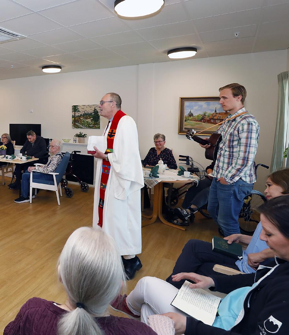 Andreas Ohlsson bjuder de boende på Välengården på tankar för dagen och en stunds trevligt umgänge med inslag av sång och musik.