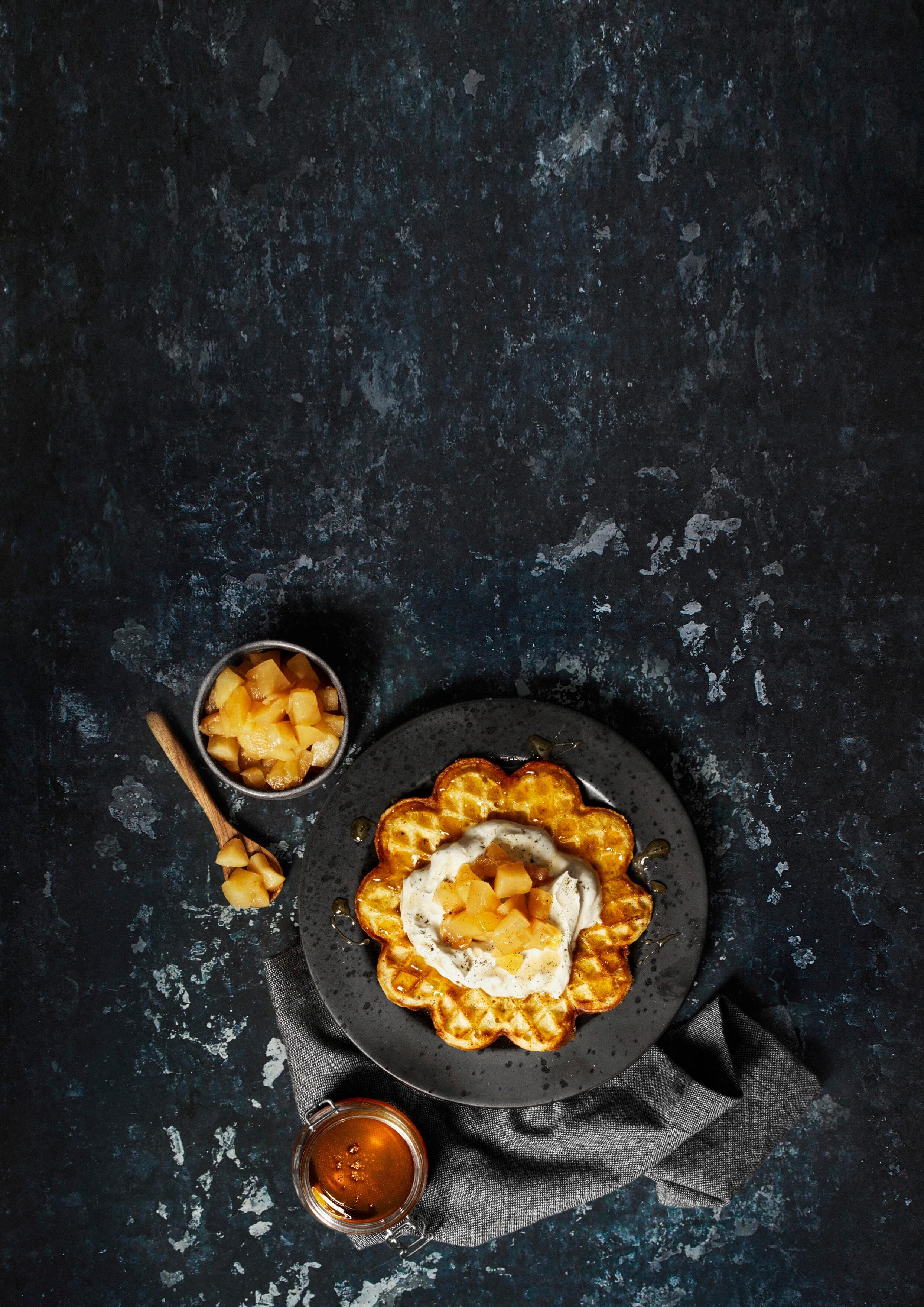 Snabbgjorda frasiga våfflor som toppas med en god äppelkompott och en klick vispgrädde. Ringla gärna på lite honung vid servering!