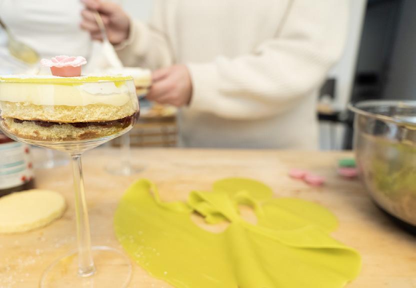 4. Lägg första bottnen längst ner i glaset, sedan sylt, botten. Spritsa i vaniljkräm och vispad vaniljgrädde. Avsluta med marsipanlock och ros. Sikta över florsocker om du vill.
