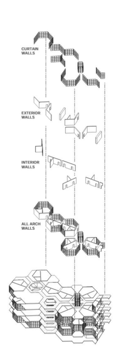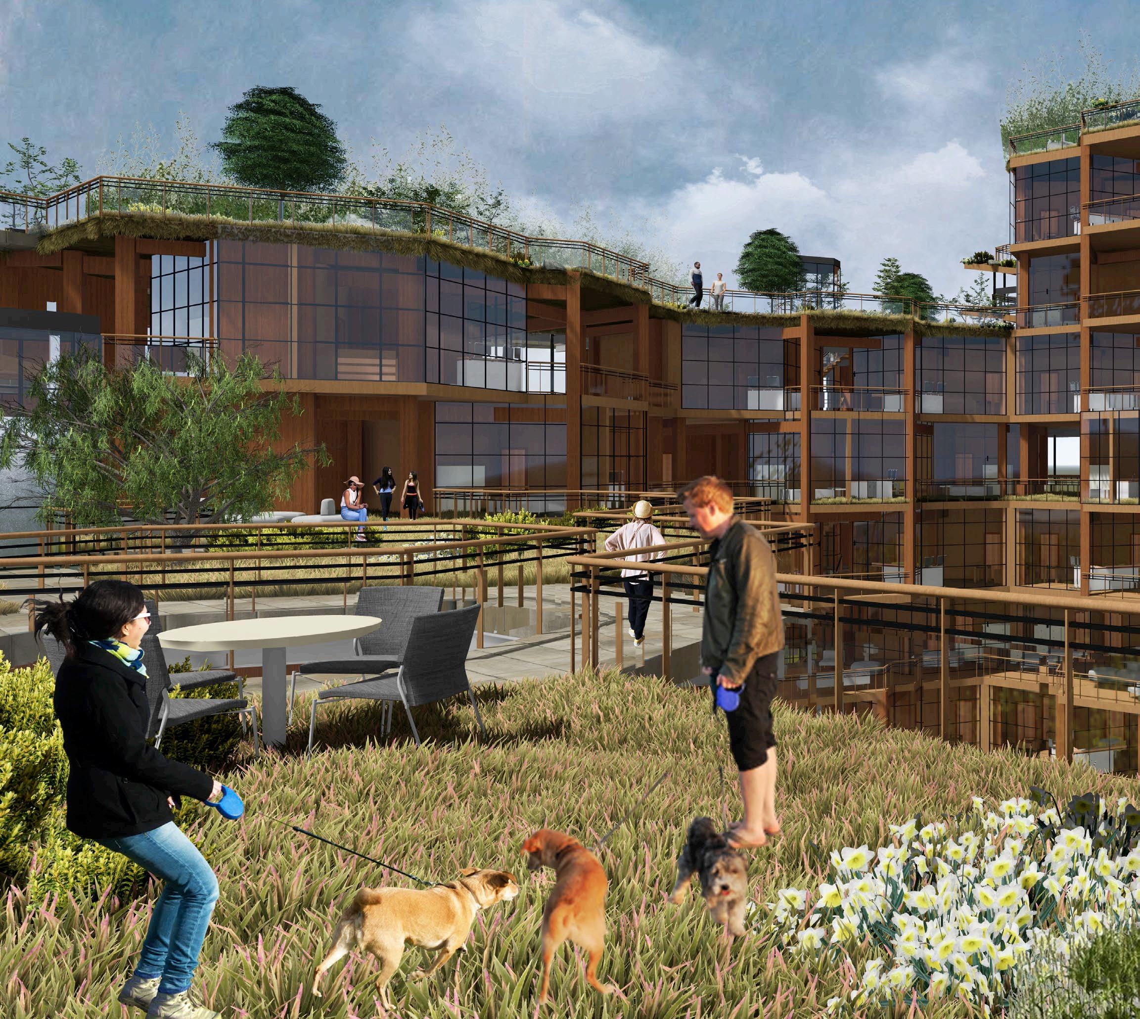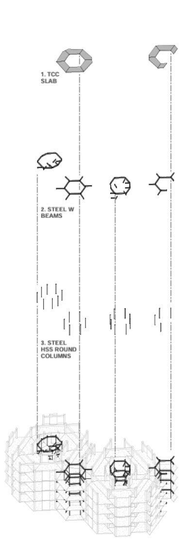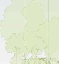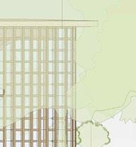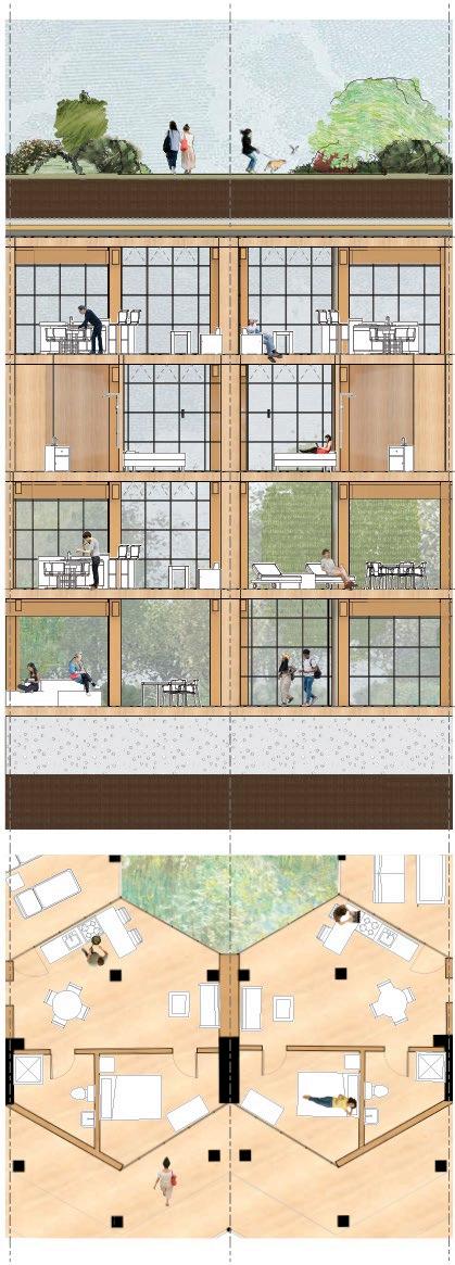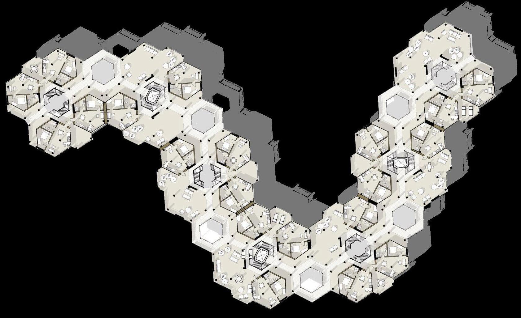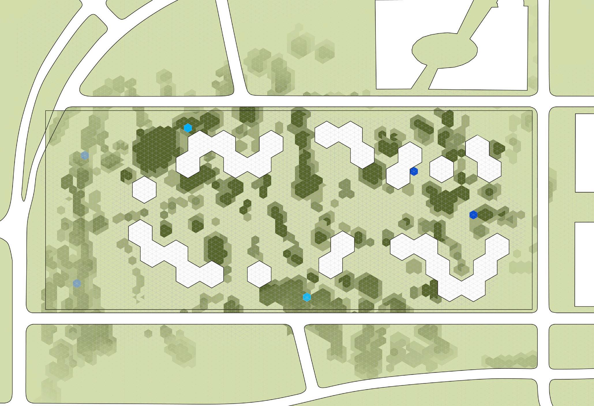 THE THIRD PRINCIPLE PROMPTED ME TO OVERLAY DIffERENT-SIzED GRIDS ON THE SITE TO DETERmine which size and shape could accurately capture the vegetation. ultimately, a hexagonal grid best captured the vegetation footprint. serendipitously, we found that ARRANGING HEXAGONAL UNITS INTO LARGER HEXAGONAL TOwERS ALLOwED US TO SNAP UNITS INTO THE SHAPE Of THE TREE CANOPY AT THE MICRO LEVEL AND AROUND THE LARGER MASSES of vegetation at a macro level. the resulting site layout is a snaking arrangement of hexagonal towers, clustered in varying numbers each tower has a different number Of LEVELS, CREATING A fLOwING SKYLINE Of GREEN ROOfS THAT TRANSPORTS THE NATURAL site atop the buildings.