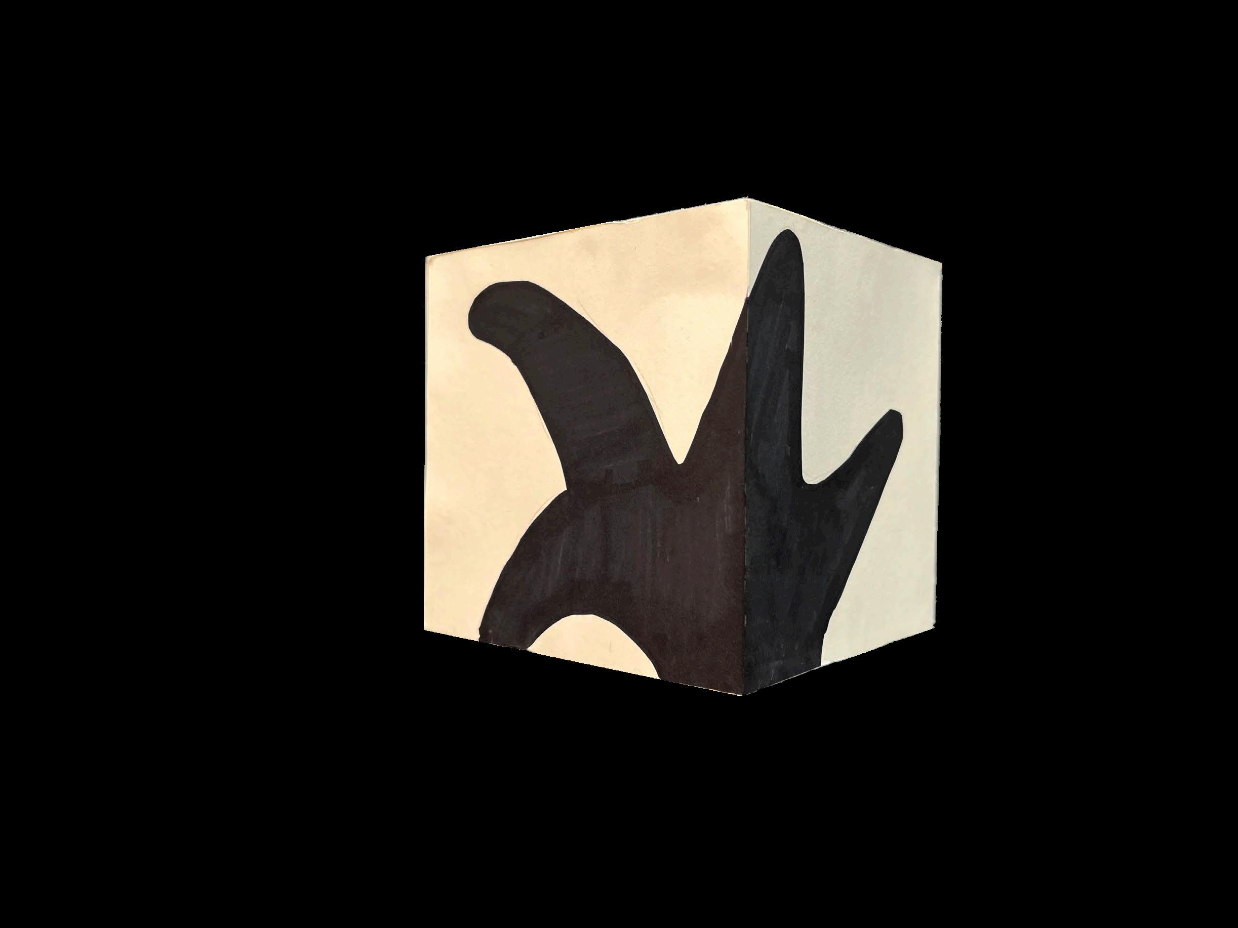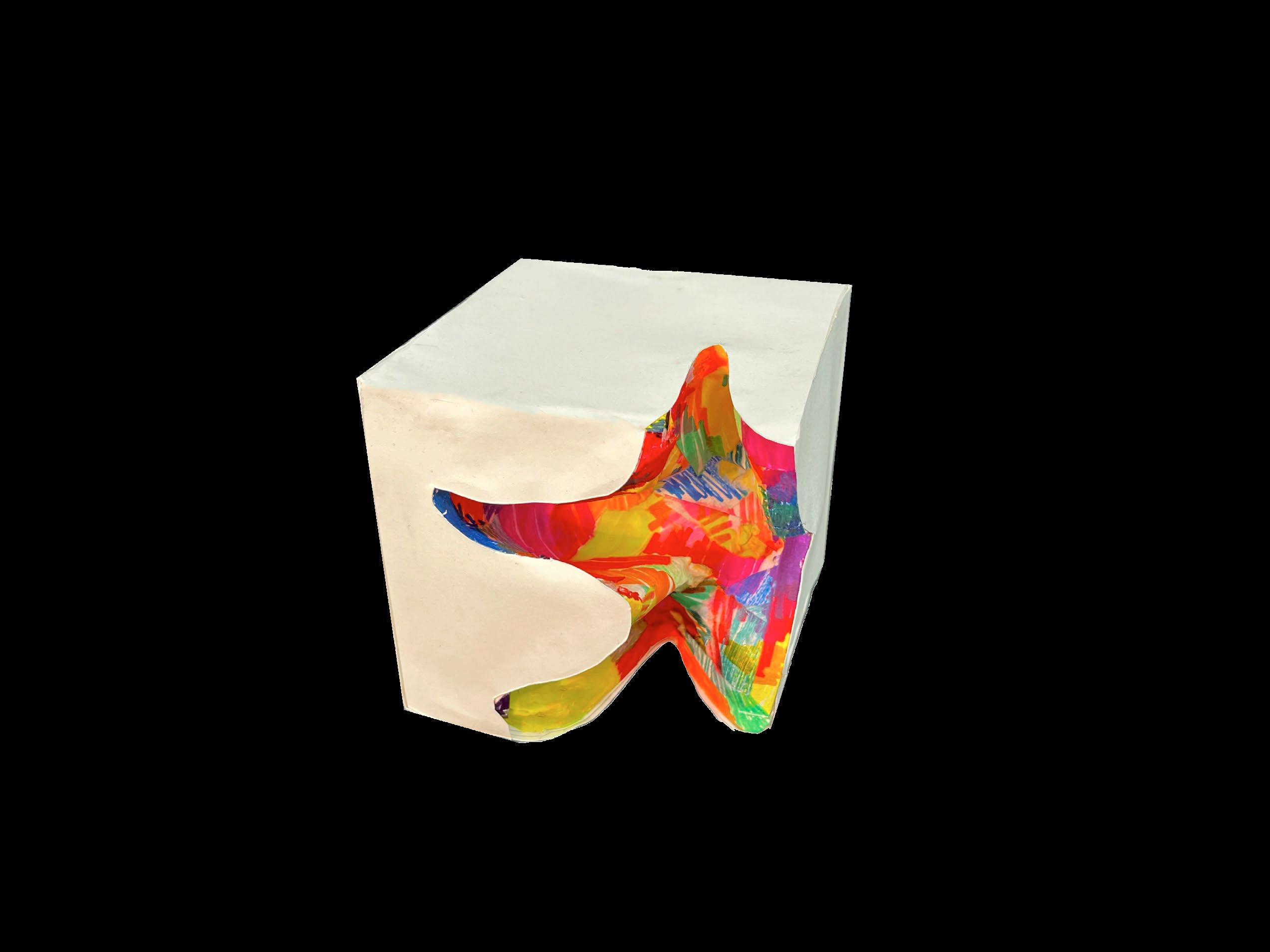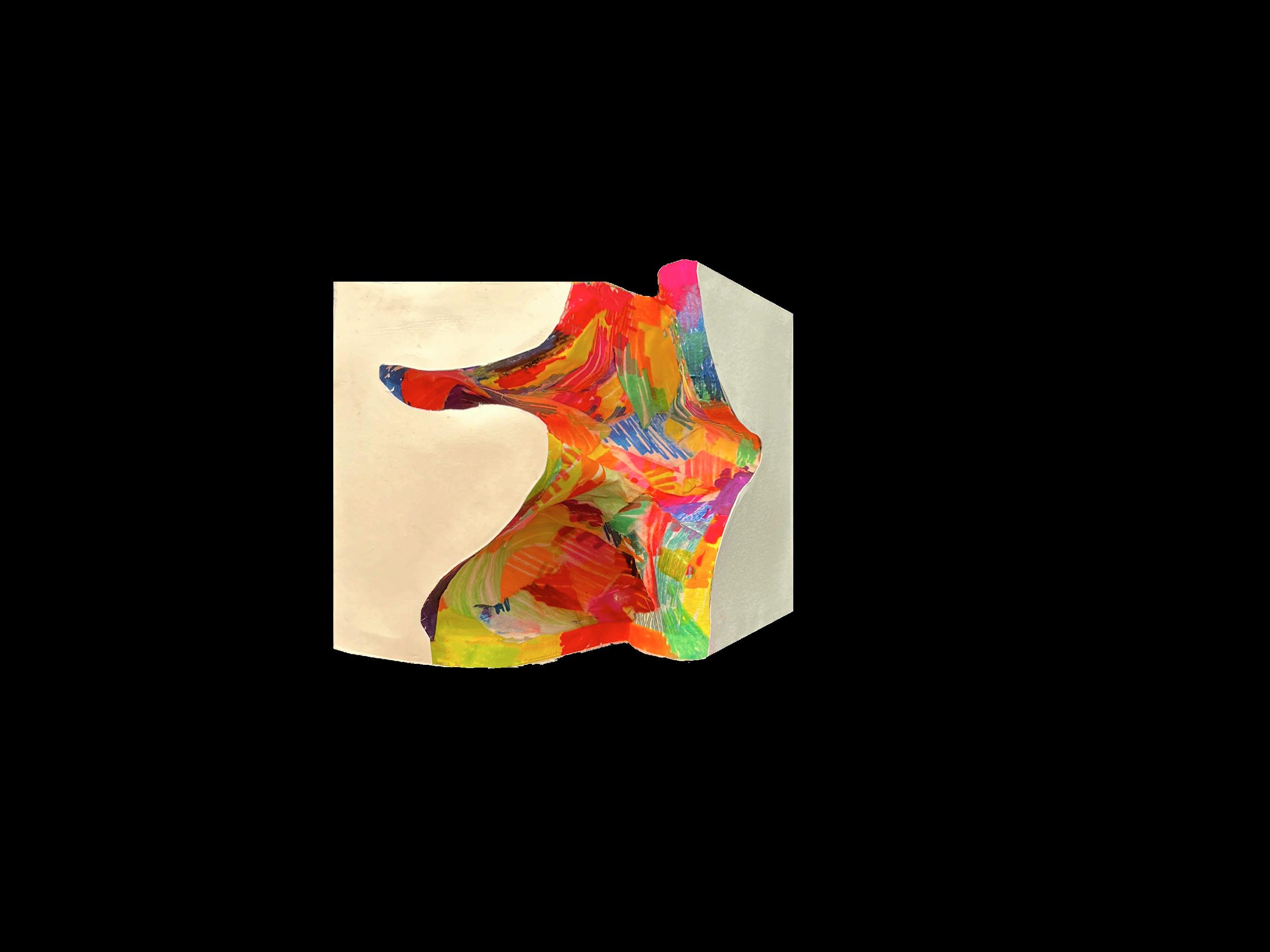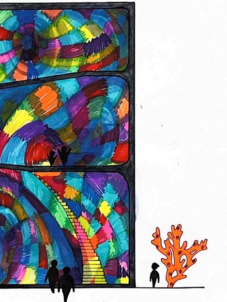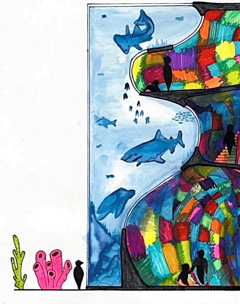 this project explores solid and void relationships via model making, creating voids on an 8x8” cube and then translating that form into an occupiable space. i investigatED wHAT fORM MIGHT EMERGE If THE SHAPE Of A STARfISH SPRAwLED ACROSS A CUBE wERE turned inward to create a void using foam core and papier-mâché, i crafted a model of this concept. then, using crayola markers and watercolor, i translated the model into a conceptual aquarium exhibit.