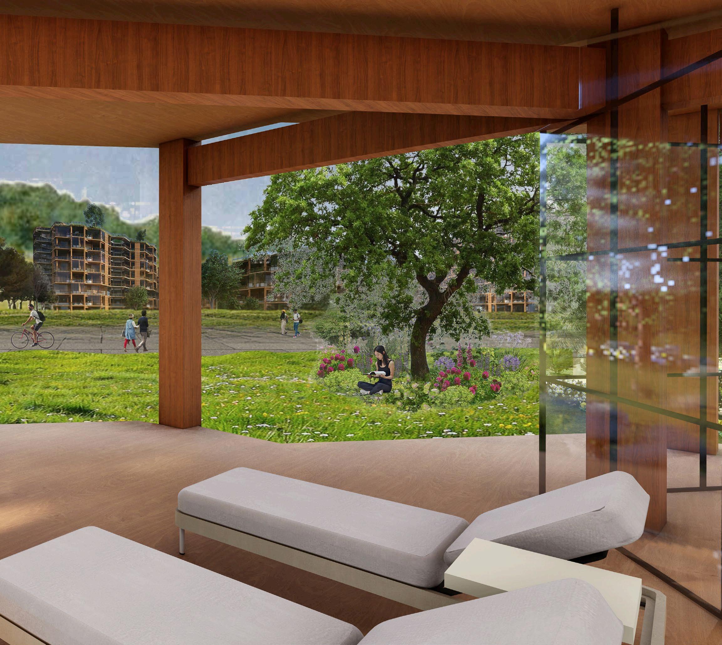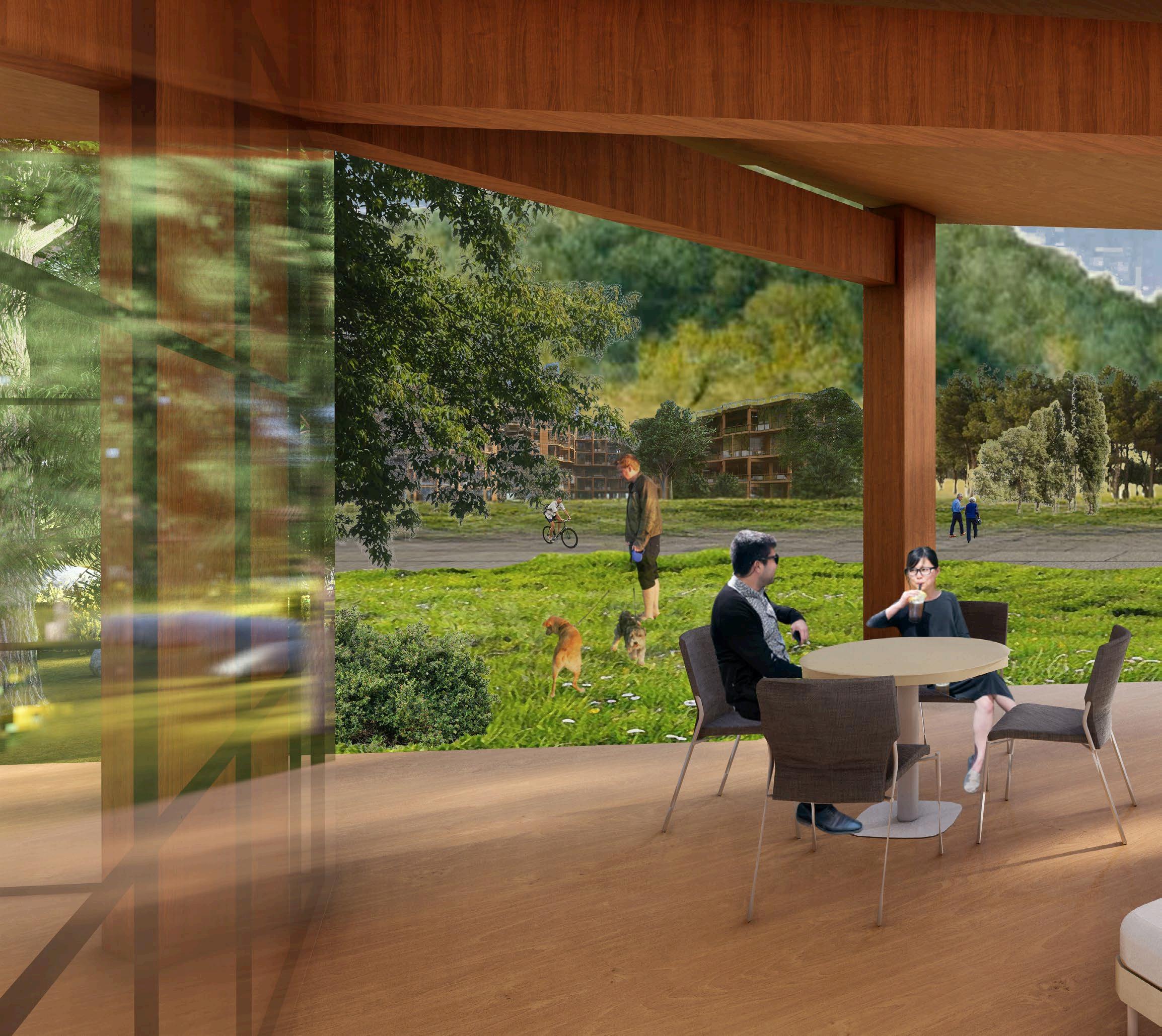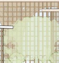 THE SITE MAY ENTICE COMMUNITY MEMBERS TO DIVERT THEIR DAILY COMMUTES Off THE SIDEwALK AND THROUGH THE PARK, OR ENCOURAGE THEM TO ENGAGE wITH NEw KINDS Of CUISINE or art no matter how patrons choose to engage with the space, the project is built to adapt and grow to fit the community’s needs, with inviting interiors, rearrangeable and reassignable vendor stalls, and a park-like exterior.