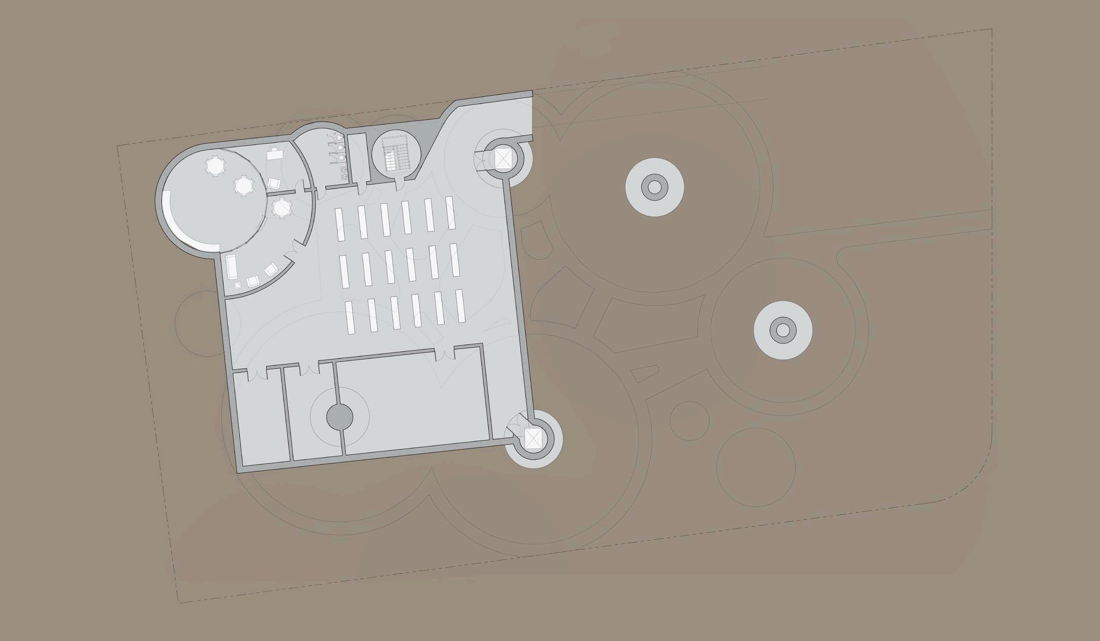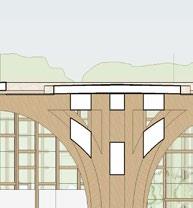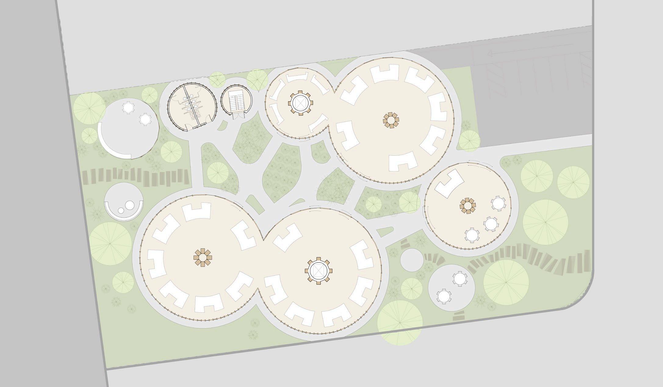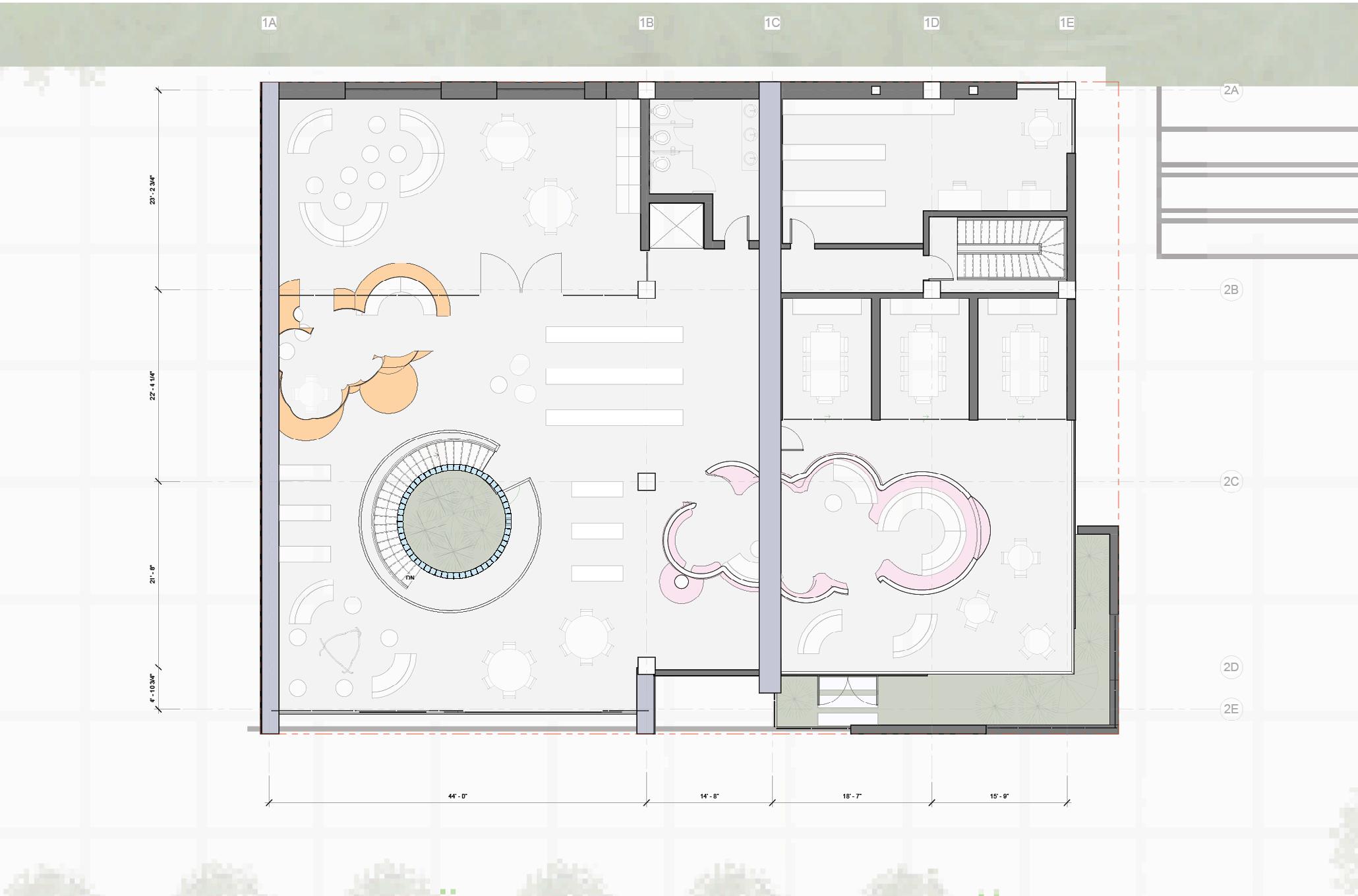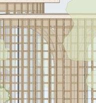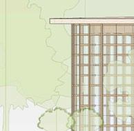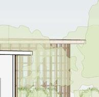 each pavilion is supported by “branches” composed of a column, a curved knee brace, and a beam. these branches form a circle in the middle of each pavilion, which connects down into the building’s “roots,” aka concrete piers. each pavilion has a dynamic system of mullions, the spacing, size, and projection length of which grow and shrink as they travel around the building. the dynamic spacing is guided by the sun path and provides shading to the pavilions’ brightest areas. the various vertical MULLION wIDTHS, COMBINED wITH THE VARIED PATTERN Of THE HORIzONTAL MULLIONS, CREATE a dappled-light effect, mimicking sunlight passing through a tree’s leaves. together, THE MULLIONS, BRANCH-LIKE STRUCTURAL SYSTEM, AND PLUNGING PIERS MIMIC THE SURROUNDing greenery and contribute to the park-like feel of the site. the basement houses vendor storage, mep facilities, and a staff lounge that connects to a sunken patio. it IS ALSO ACCESSIBLE VIA TwO ELEVATORS THAT RISE COVERTLY fROM wITHIN THE RING Of STRUCtural supports to connect the storage facility and the marketplace.