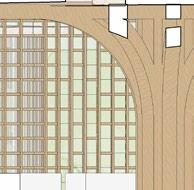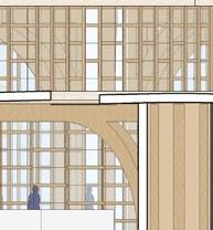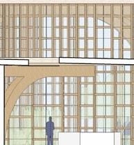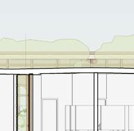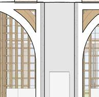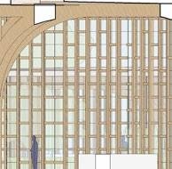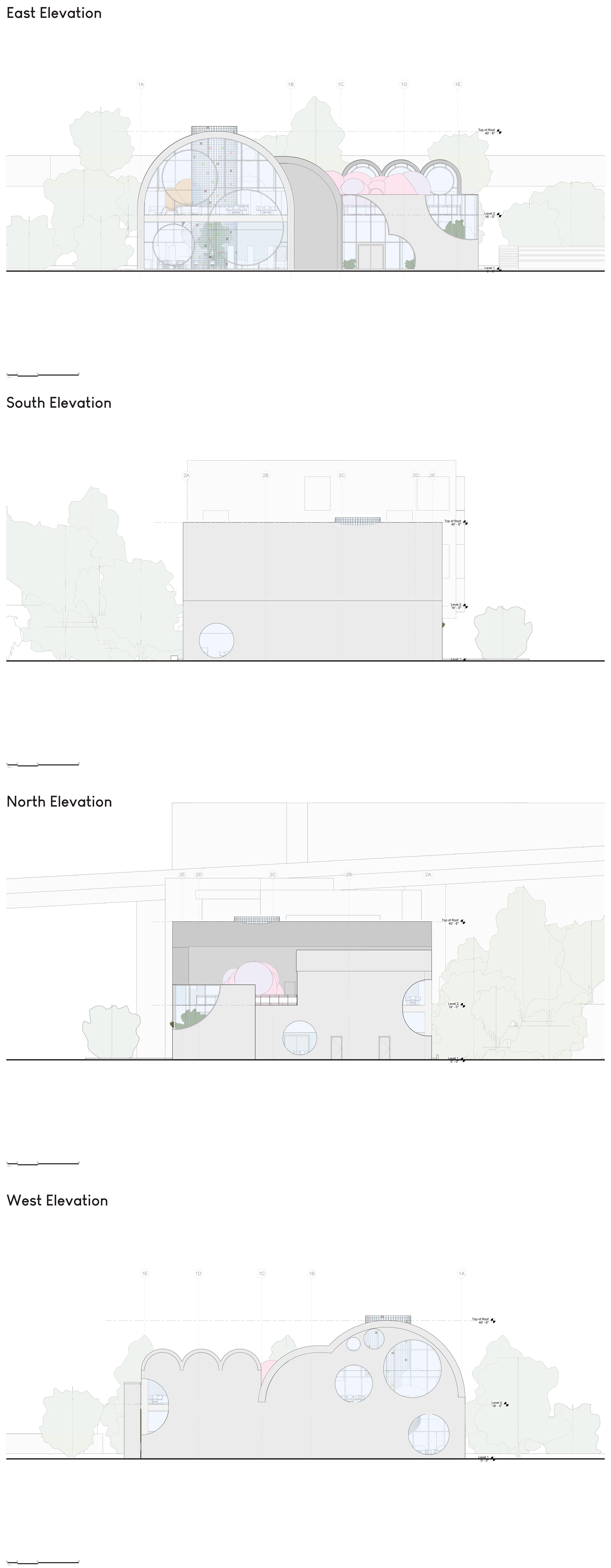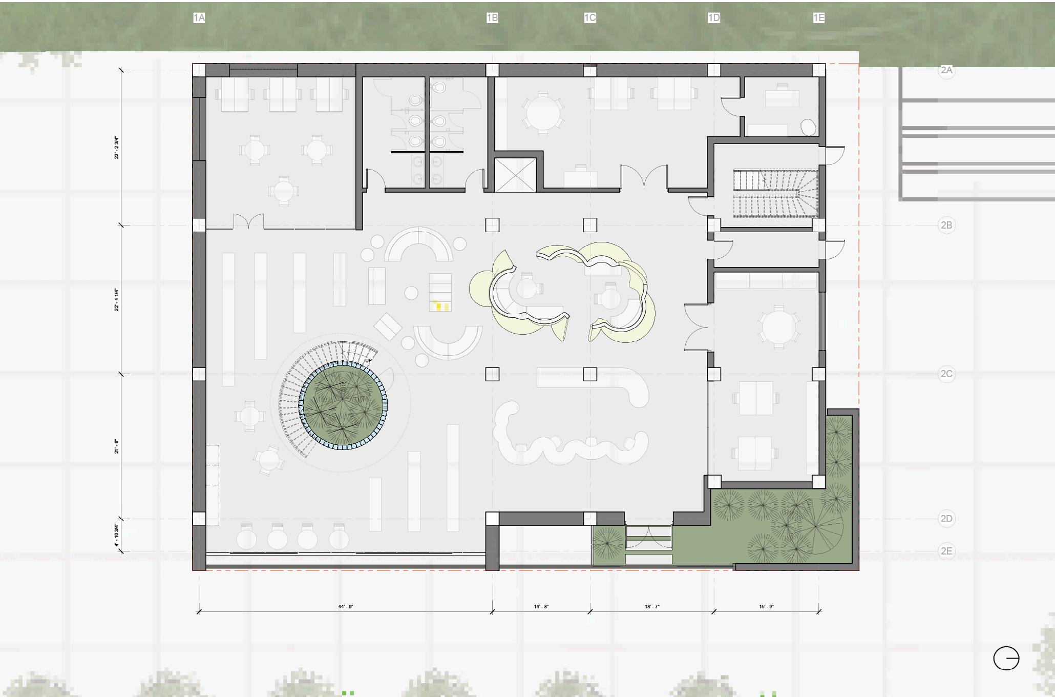 each pavilion is supported by “branches” composed of a column, a curved knee brace, and a beam. these branches form a circle in the middle of each pavilion, which connects down into the building’s “roots,” aka concrete piers. each pavilion has a dynamic system of mullions, the spacing, size, and projection length of which grow and shrink as they travel around the building. the dynamic spacing is guided by the sun path and provides shading to the pavilions’ brightest areas. the various vertical MULLION wIDTHS, COMBINED wITH THE VARIED PATTERN Of THE HORIzONTAL MULLIONS, CREATE a dappled-light effect, mimicking sunlight passing through a tree’s leaves. together, THE MULLIONS, BRANCH-LIKE STRUCTURAL SYSTEM, AND PLUNGING PIERS MIMIC THE SURROUNDing greenery and contribute to the park-like feel of the site. the basement houses vendor storage, mep facilities, and a staff lounge that connects to a sunken patio. it IS ALSO ACCESSIBLE VIA TwO ELEVATORS THAT RISE COVERTLY fROM wITHIN THE RING Of STRUCtural supports to connect the storage facility and the marketplace.