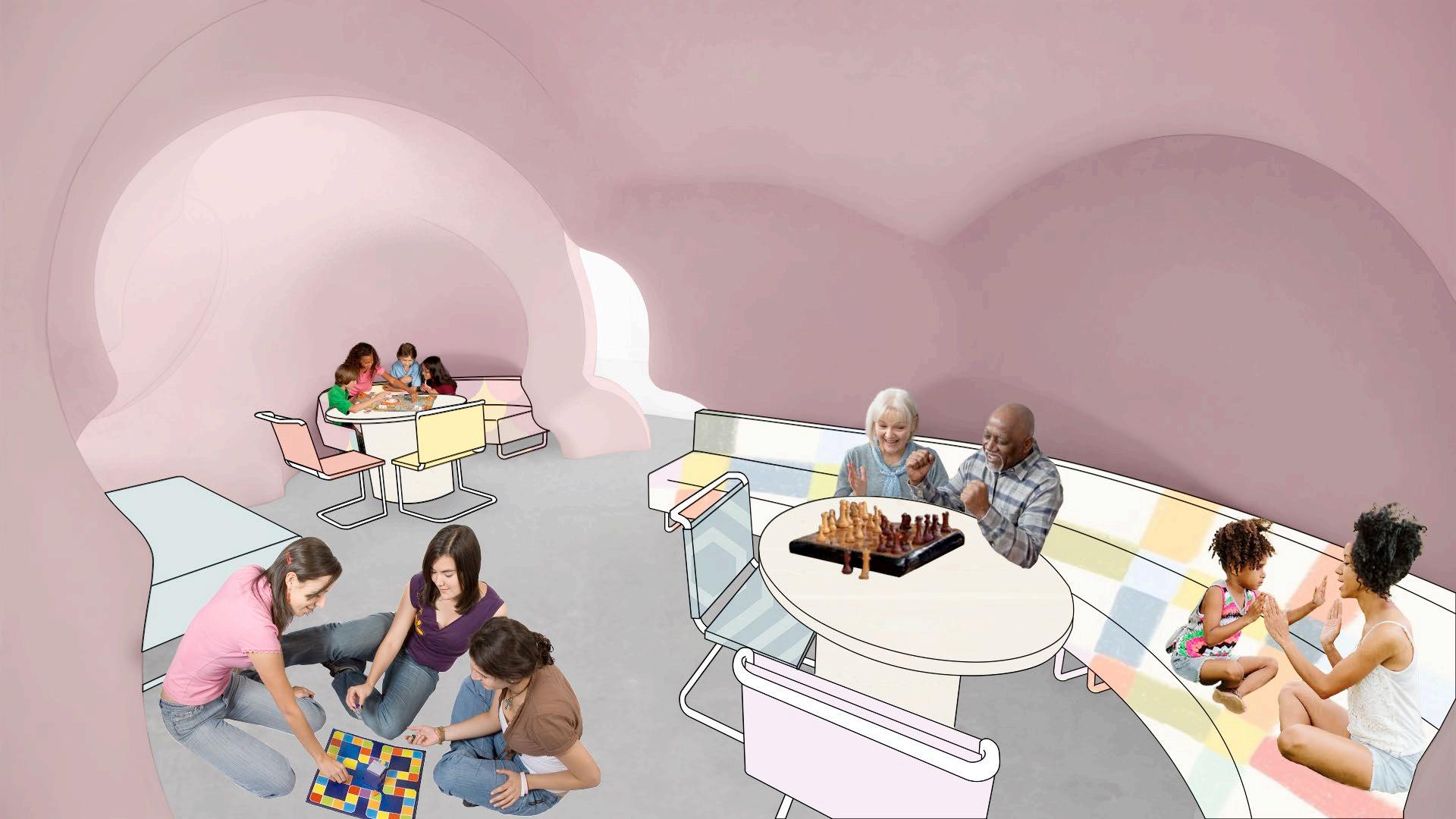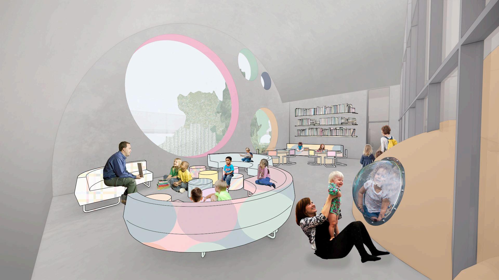 “ the blobs,” as they affectionately came to be known, began as an idea for a distinctive teen space that felt cozy and “cool” to teens and young adults. the concept EXPANDED TO OTHER AREAS Of THE LIBRARY, OffERING PATRONS Of ALL AGES THE CHANCE TO study or explore these amorphous forms. housing playful programming elements SUCH AS THE GAME zONE AND EARLY LITERATURE, THE BLOBS INTERACT wITH THE wALLS AND floors, often intersecting with and disrupting these stagnant elements their bubble wINDOwS LET LIGHT PEEK IN AND ALLOw OCCUPANTS TO LOOK OUT, EVOKING THE fEELING Of being inside a spaceship.