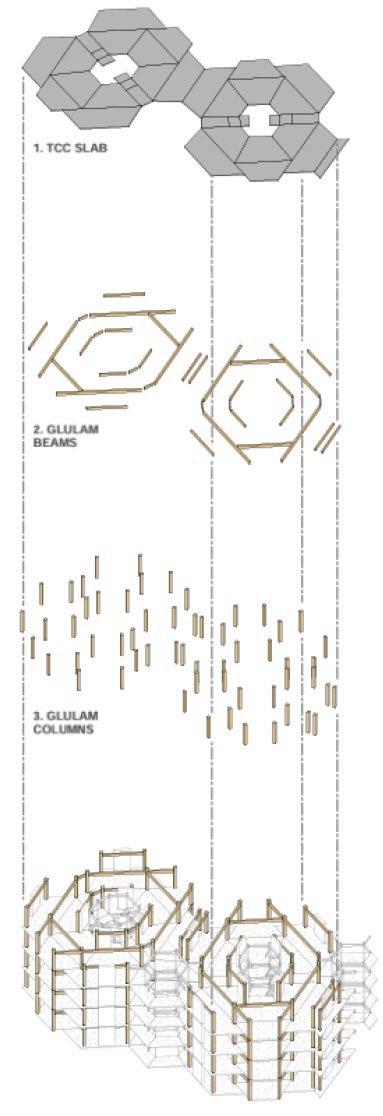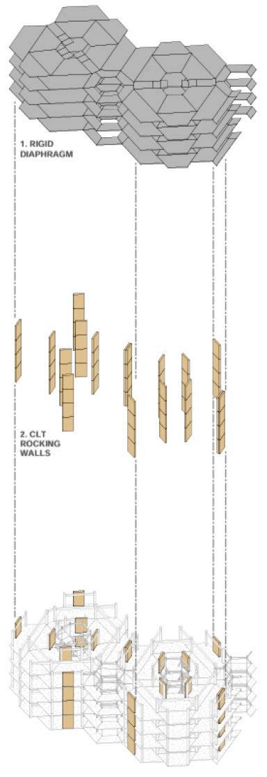 EACH UNIT IS SUPPORTED LATERALLY BY A SYStem of columns and rocking walls. these STRUCTURAL COMPONENTS POSED A CHALLENGE wHEN DEVELOPING A SERIES Of DIffERent unit layouts. however, by using timBER STRUCTURAL ELEMENTS AND EMBRACING THEIR VISIBILITY, wE wERE ABLE TO CREATE A system that supports the project’s physical and aesthetic needs.