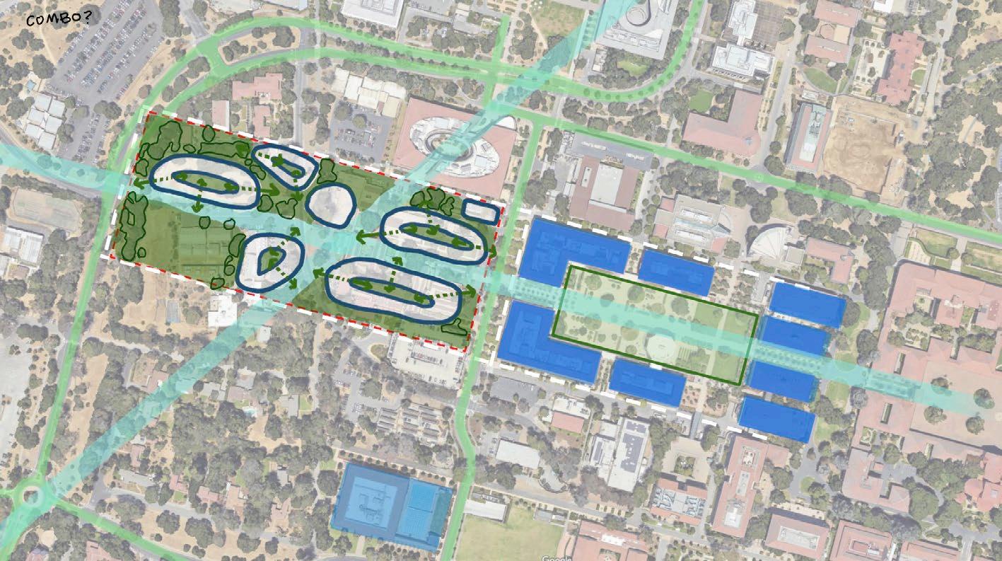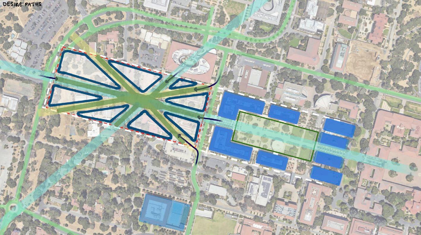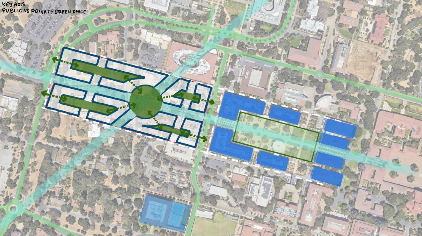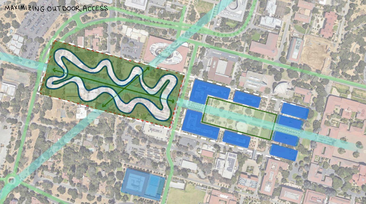 the site layout developed around three core principles. first, preserve the central axis, which begins in stanford’s main quad and will continue through the new quad. SECOND, MAXIMIzE THE EXTERIOR SURfACE AREA TO BUILDING wIDTH RATIO SO THAT EVERY UNIT has strong exterior views. and lastly, respect the original vegetation on the site, most importantly the key trees identified by the stanford arborist.