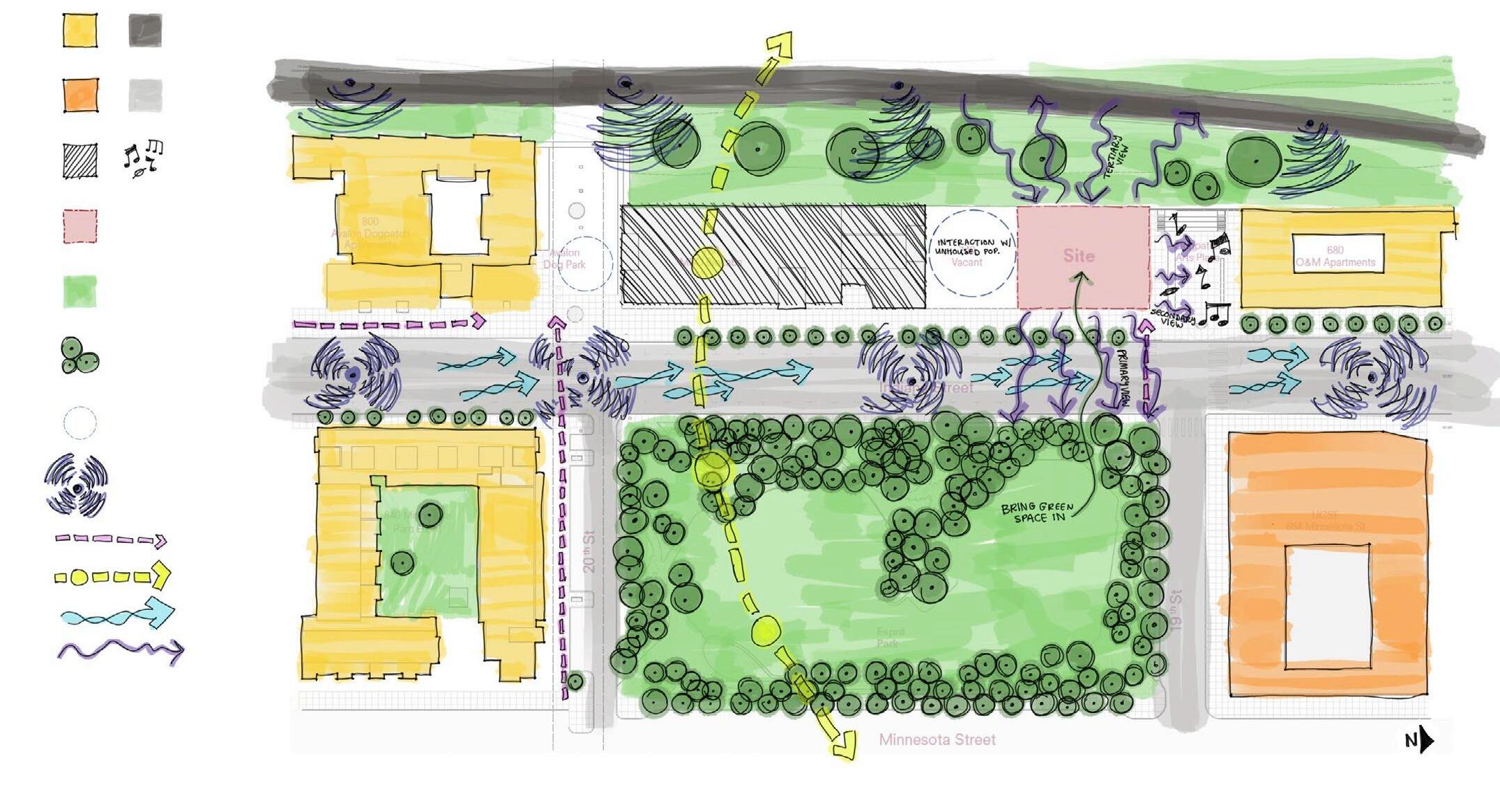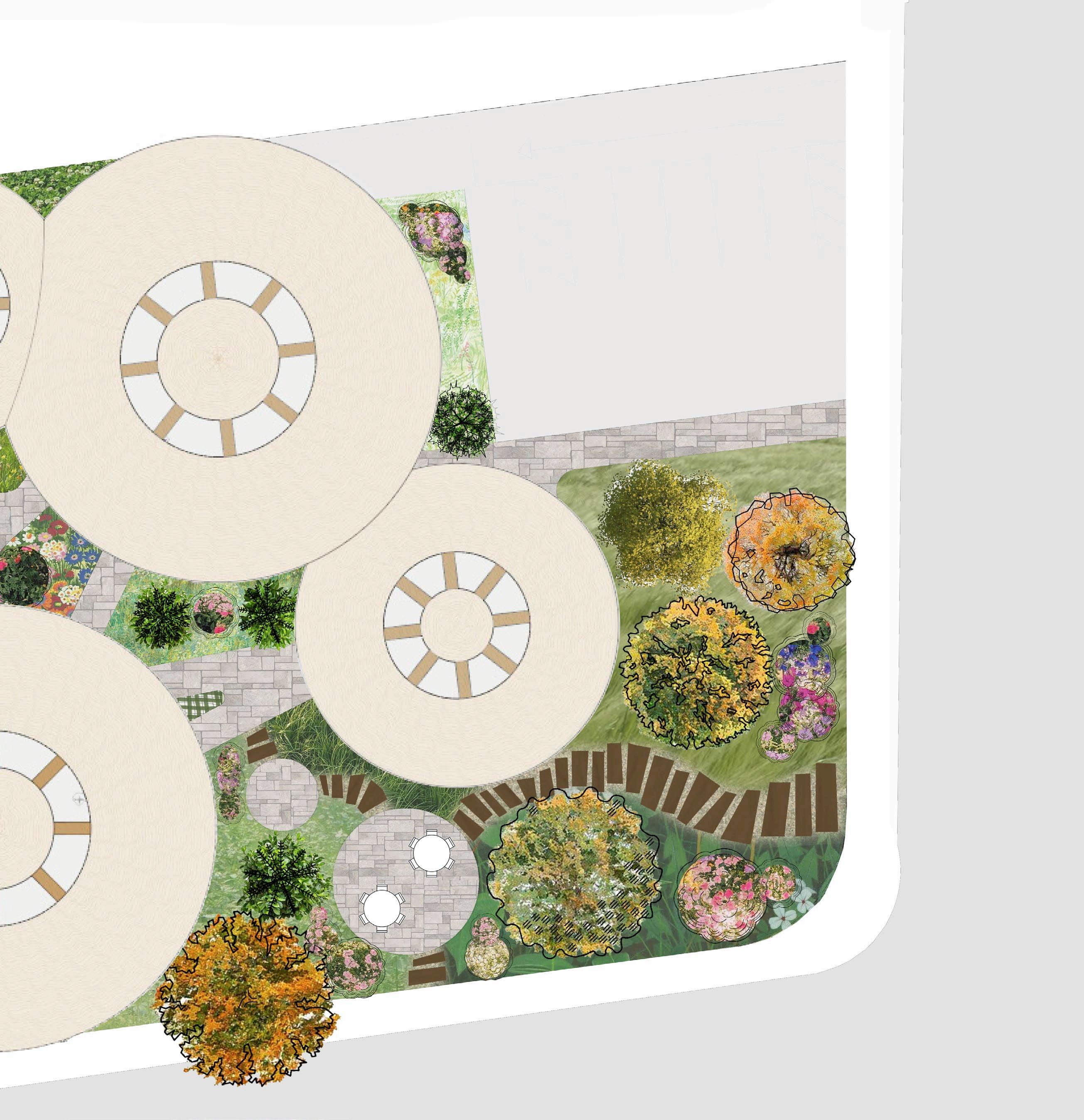 the final landscaping plan reflects the project’s ethos. it is a place to shop, but also to meander, explore, or settle in. you can bounce between pavilions, gathering treats and crafts from different vendors, or sit down and relax with your friends you can enjoy nature by wandering along a winding garden path or by settling on one of the paved patio spaces.