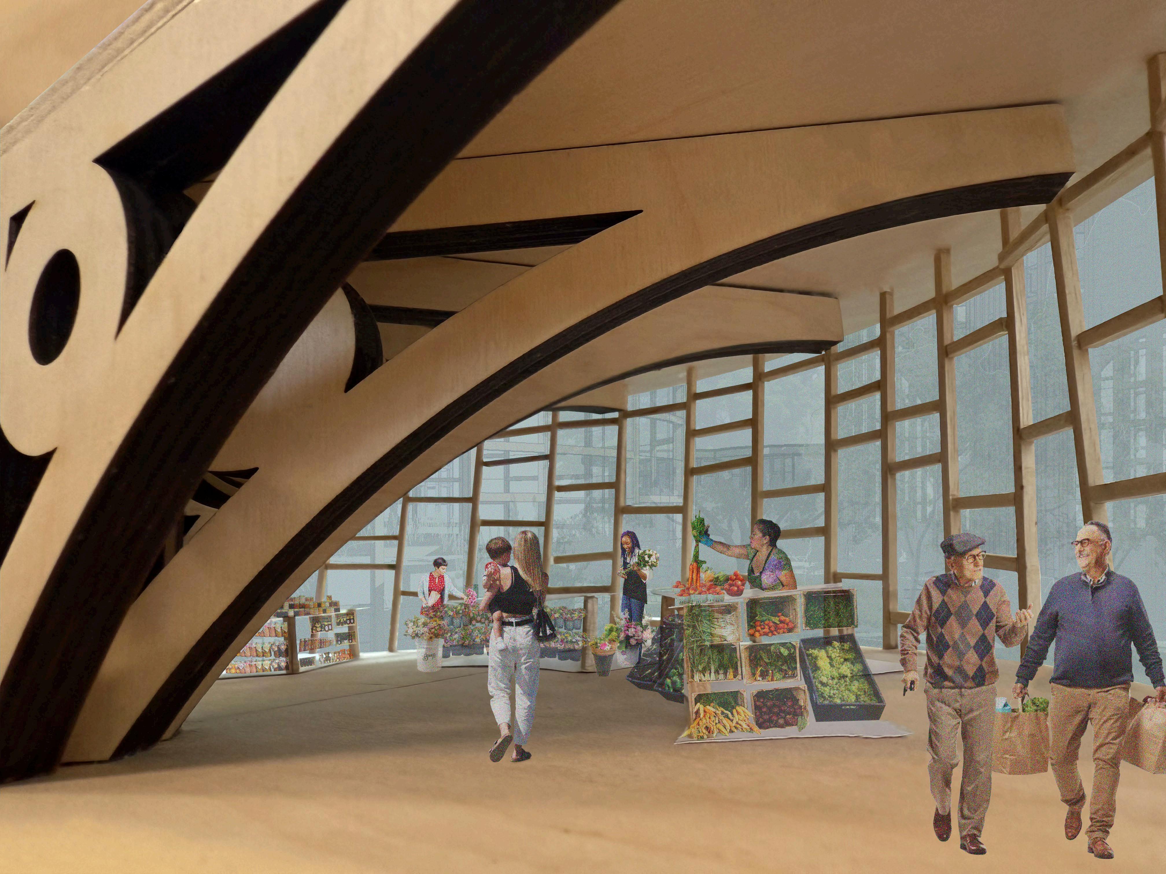 wHEN DESIGNING A MARKETPLACE fOR THE RAPIDLY EVOLVING CITY Of EAST PALO ALTO, I AIMED TO CREATE A COMMUNITY-fOCUSED MARKET AND GATHERING PLACE THAT UPLIfTS LOCAL ARTIsans. initially, the project’s neighborhood was introduced to us as a food desert. however, upon visiting the site, which is currently a mcdonald’s, i made two realizations. first, there is a well-stocked, family-owned supermarket across the street from the site. second, the mcdonald’s currently occupying the site is an important hub for the community. during my visit, i witnessed friends sharing breakfast, coworkers grabbing coffee on their way to work, mcdonald’s employees sitting and CHATTING wITH PATRONS, AND EVEN A SLIDESHOw, DESIGNED BY AN EMPLOYEE, fEATURING fAmous black inventors playing on the tv.