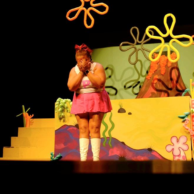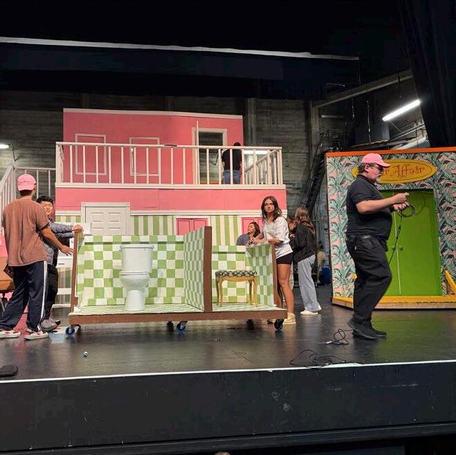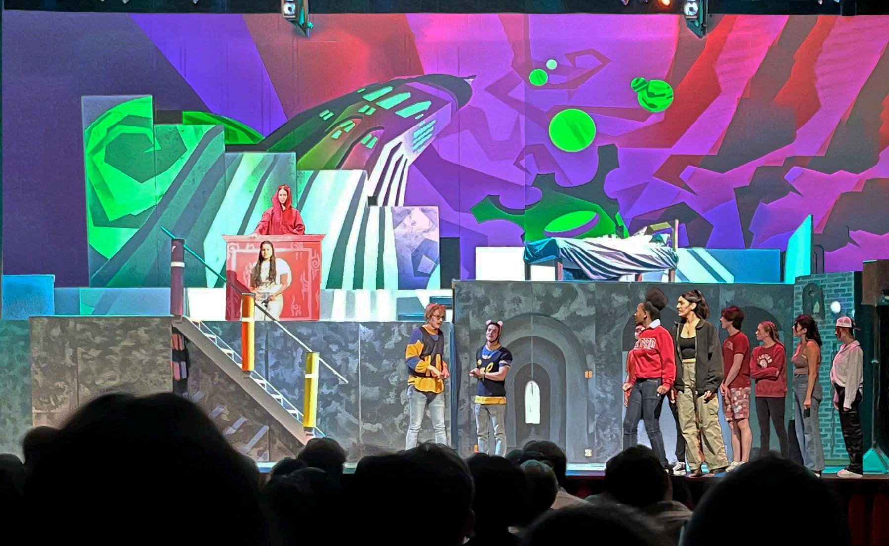 campy, flamboyant, brutalist. these were the guiding design principles for the gaieties 2022 set. by contrasting fiery pinks and reds with stark concrete, we transported stanford into a horrifying alternate dimension. the unusually high, brutalist platfORMS SHIfTED AUDIENCE PERSPECTIVES, fORCING THEM TO LOOK UPwARD, AS THOUGH THEY were in the depths of hell alongside the actors. using projection as a storytelling device, we created a dynamic background that morphed with the script.