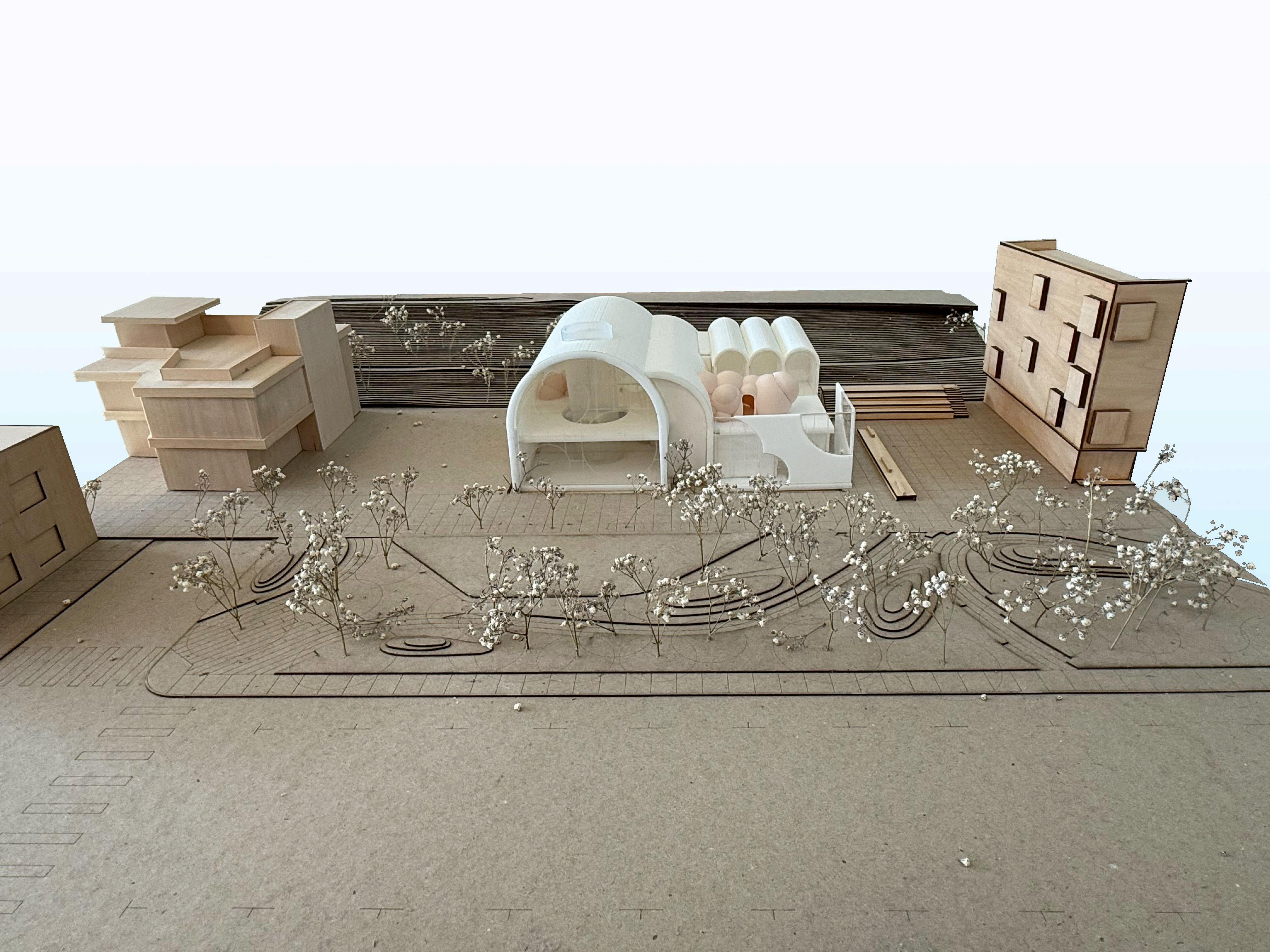 wHEN DESIGNING A SAN fRANCISCO BRANCH LIBRARY fOR THE DOGPATCH NEIGHBORHOOD, I AIMED TO CREATE A PLAYfUL, INVITING SPACE THAT CONNECTS wITH ITS GREEN SURROUNDINGS and reflects the neighborhood’s rich and evolving culture. i was interested in posiTIONING THE LIBRARY AS A COMMUNITY HUB AND THIRD SPACE, wELCOMING A wIDE RANGE Of patrons. my goal was to support both quiet individual use and more informal social activity. i intended to make the layout feel intuitive and accessible rather than instiTUTIONAL, AND TO ENSURE THE BUILDING COULD ENTICE PEOPLE TO ENTER fROM ALL SIDES Of the site, including the freeway behind it i also considered how natural light could BE USED TO CREATE A BRIGHT, UPLIfTING INTERIOR wHILE PROTECTING THE BOOK COLLECTION from long-term light exposure and keeping energy use low.