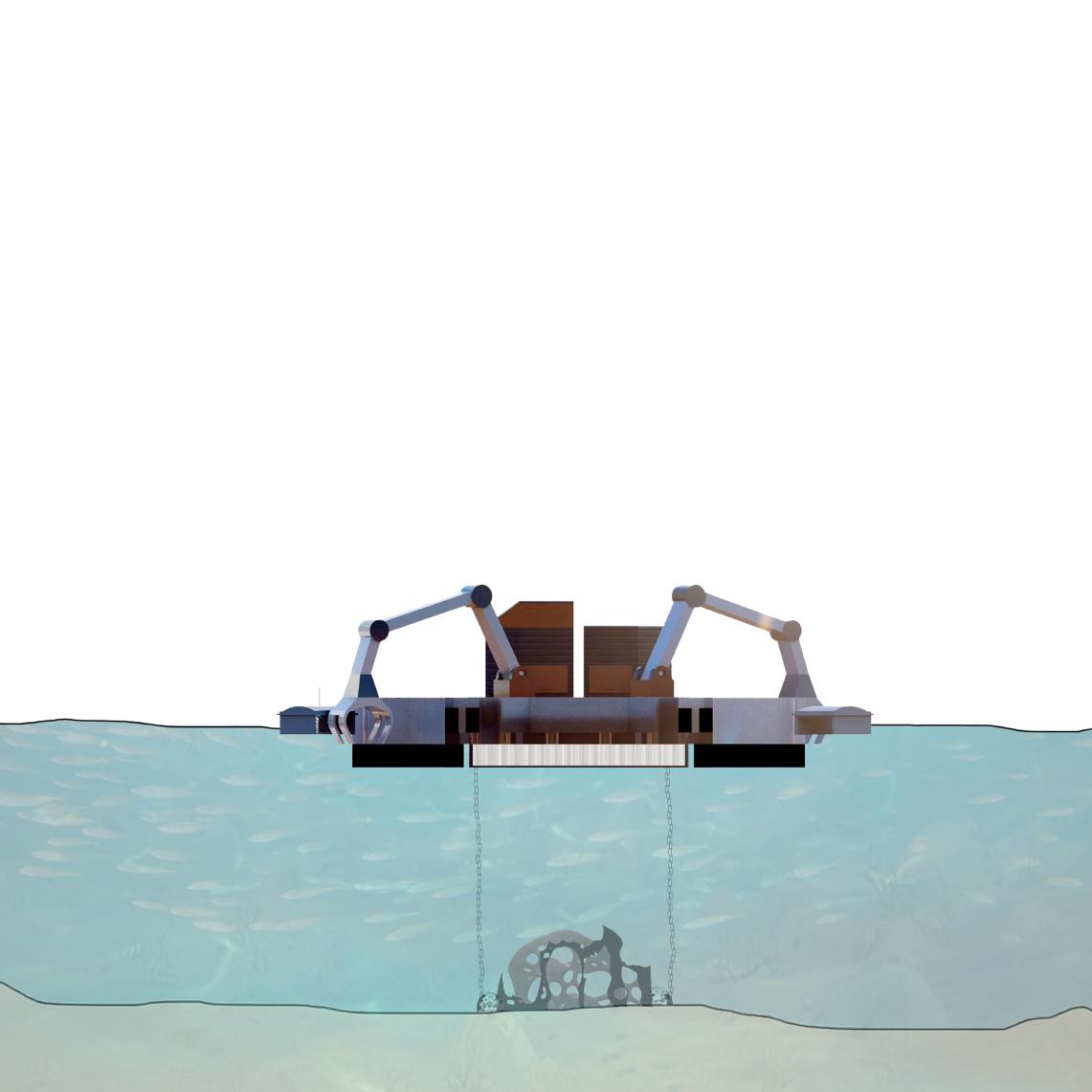The main waste management module acts as a central hub for the collection of solid waste from the robots and bar screens. The recessed bins can be removed for emptying and recycling off site. Bar screens are built into the outside of many of the modules within the entire system as another means of managing physical waste missed by the robots.