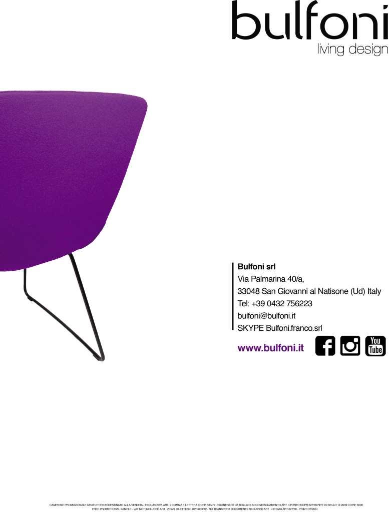 Il consumo tessuto è valido a partire da 10 pezzi ed è espresso in metri lineari in altezza 140 cm senza eventuali centraggi. Bulfoni si riserva in diritto di non accettare il rivestimento del cliente. Anche quando il rivestimento è accettato Bulfoni non è responsabile per la sua qualità una volta applicato su un prodotto Bulfoni. I tessuti spediti dai clienti devono pervenire provvisti di etichetta che evidenzi e specifichi il lato e la direzione per la sua applicazione. Il tessuto inviatoci dai clienti deve arrivare alla nostra azienda in porto franco e, se proveniente da Paesi non membri CEE, accompagna to dal certificato di origine, che è indispensabile per lo sdoganamento in Italia. Eventuali costi di trasporto e/o dogana da noi sostenuti, verranno riaddebitati in fattur a.