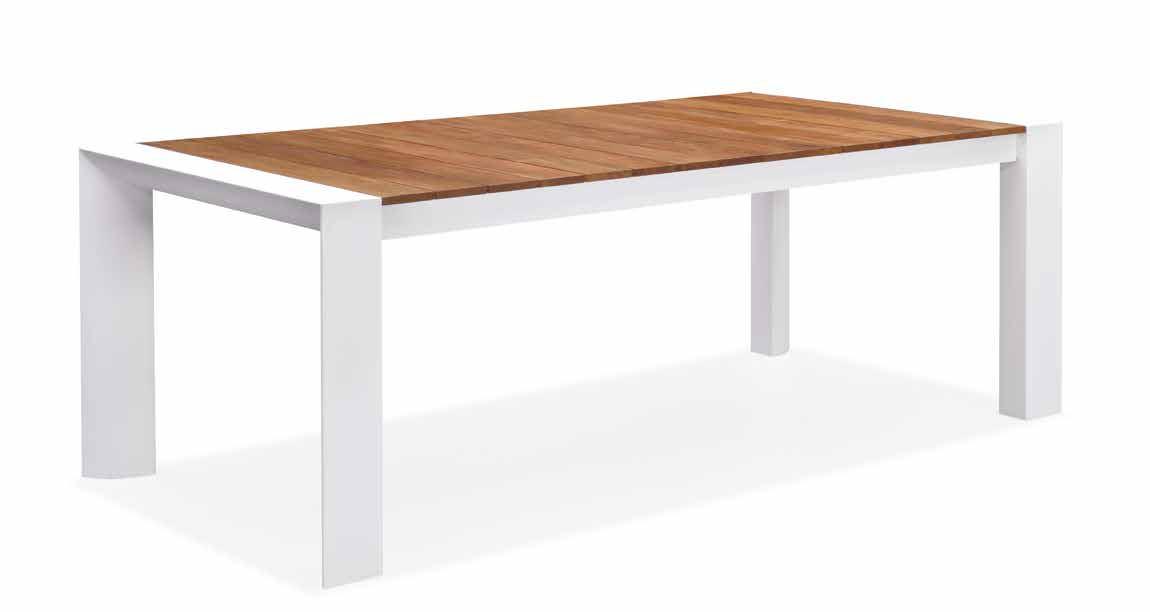 Coordinato modulare composto da due divani, un lineare, un angolo e un tavolino. Struttura in alluminio, teak e gomma drenante fast dry foam e rivestimento in tessuto Sunbrella®. Adatto ad un uso esterno.