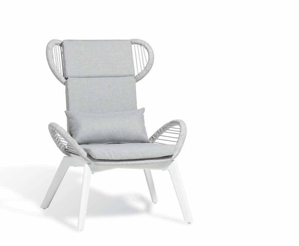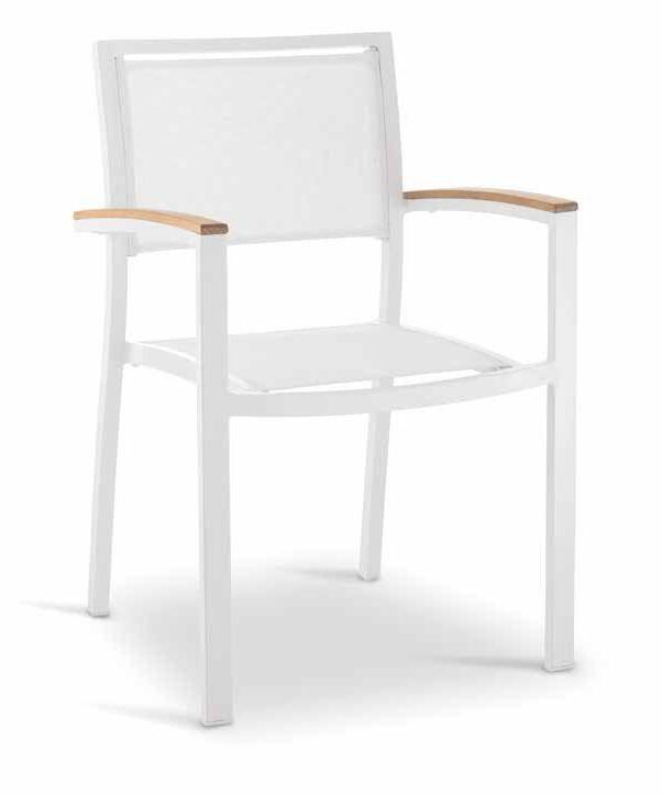 Poltroncina impilabile in alluminio con rivestimento in textilene e gomma. Cuscineria in textilene o Olefin. Aluminium stackable armchair covered with textylene and rubber rope. Textylene or Olefin cushions.