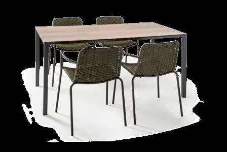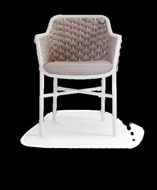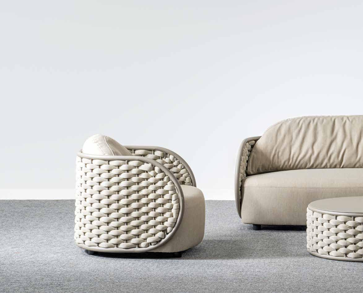 Coordinato con struttura in alluminio e rivestimento in corda poliestere ø 6 mm, composto da un divano 2 posti, due poltrone e un tavolino con piano in alluminio. Cuscineria sfoderabile in tessuto acrilico. Aluminium set covered with ø 6 mm polyester rope with one sofa 2 seaters, two armchairs and a table with aluminium top. Acrylic fabric cushions.