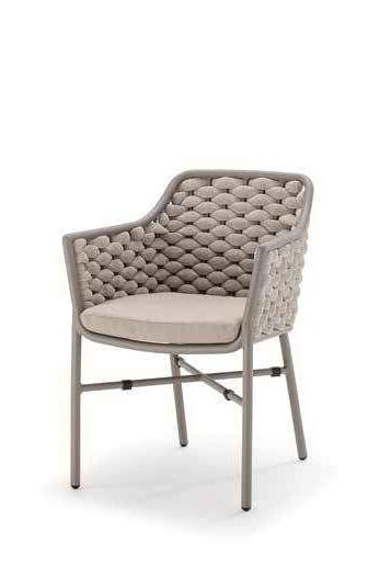 Poltroncina in alluminio verniciato con rivestimento in corda acrilica e gomma, con trattamento Teflon. Cuscino sfoderabile, tessuto acrilico. Aluminium armchair covered with acrylic rope Teflon treated. Upholstered cushion with acrylic fabric.