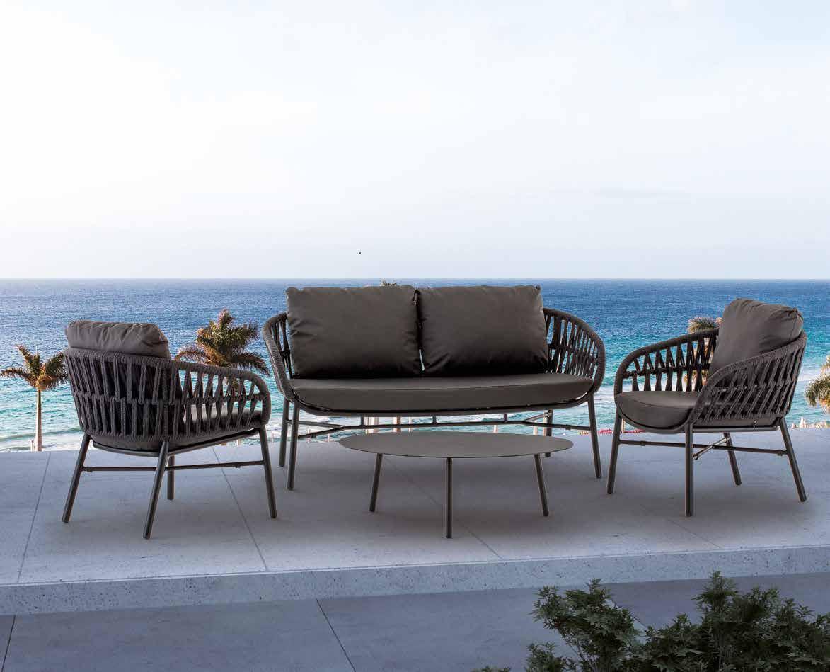 Coordinato con struttura in alluminio e rivestimento in corda poliestere Ø 4 mm, composto da un divano 3 posti, due poltrone e un tavolino con piano in alluminio. Cuscineria sfoderabile in tessuto acrilico. Aluminium set covered with Ø 4 mm polyester rope with one sofa 3 seaters, two armchairs and a table with aluminium top. Acrylic fabric cushions.