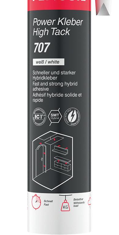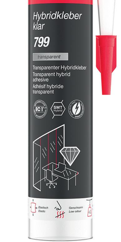Verwenden Sie Hybridklebstoffe für Arbeiten, die eine schnelle, dauerhaſt elastische, besonders starke und beständige Verbindung erfordern. Hybridklebstoffe sind für den Innen- und Außenbereich geeignet: Sie sind UV- und witterungsbeständig und können sogar auf feuchten Oberflächen eingesetzt werden. Außerdem haben Hybridklebstoffe sehr gute schwingungs- und geräuschdämpfende Eigenschaſten.