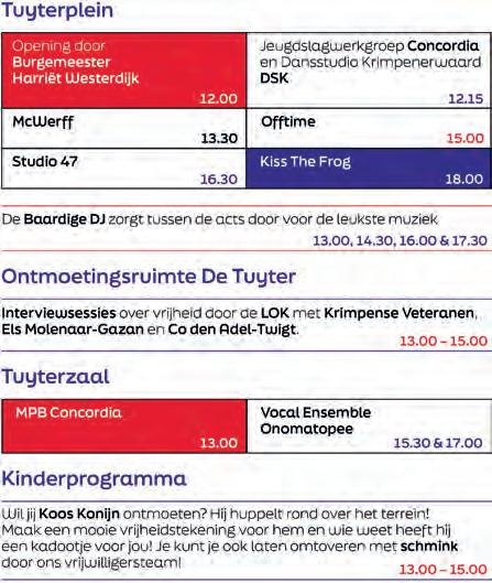 Een dag later, op maandag 5 mei, vieren we de vrijheid in Nederland. Een groep enthousiaste Krimpenaren is aan de slag gegaan met een mooi programma in De Tuy ter. Met muziek, eten en drinken en ontmoeting. Zie ik u ook op 5 mei?