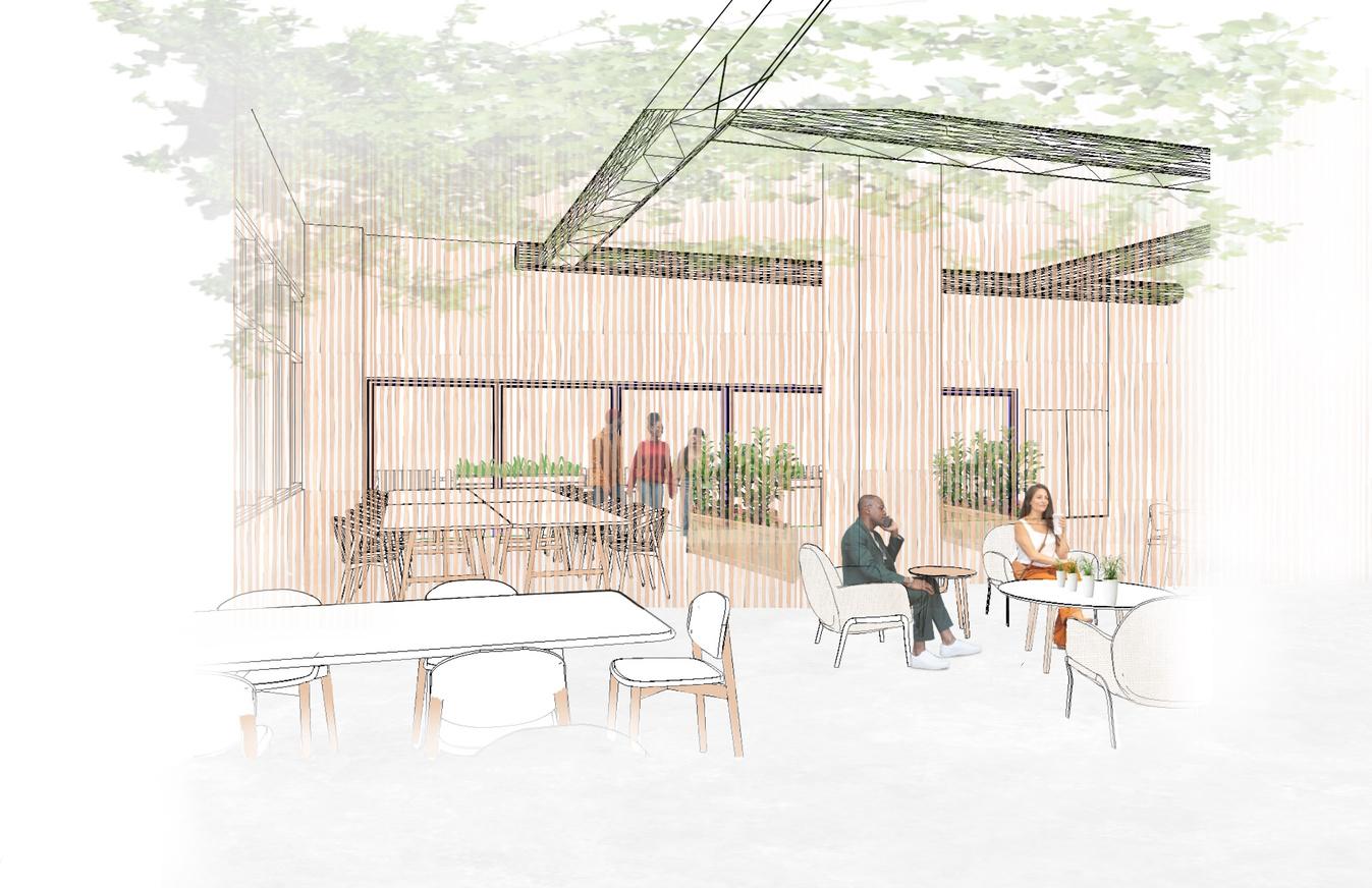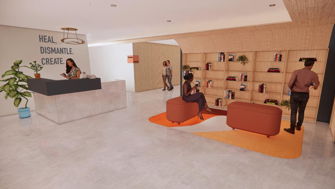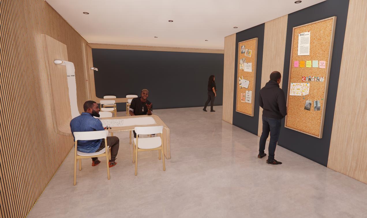 The formal storytelling space stands as a memorial for those lost to radicalized police violence, offering a sanctuary for remembrance and contemplation. Engraved on a flowing wooden structure within the space are the names of the departed, visible to those outside but fully understood only upon entering. Transitioning seamlessly as it becomes a ceiling element that guides into the informal storytelling area, this space provides individuals with a quiet moment for personal reflection Here, survivors come together, fostering connections and collective reflection, fostering a sense of community and support.
