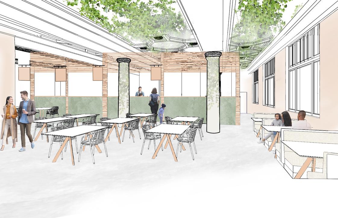 Gathering spot for people enjoying the vendors to socialize at 4 vendors providing different cultures food with their signature herb.
